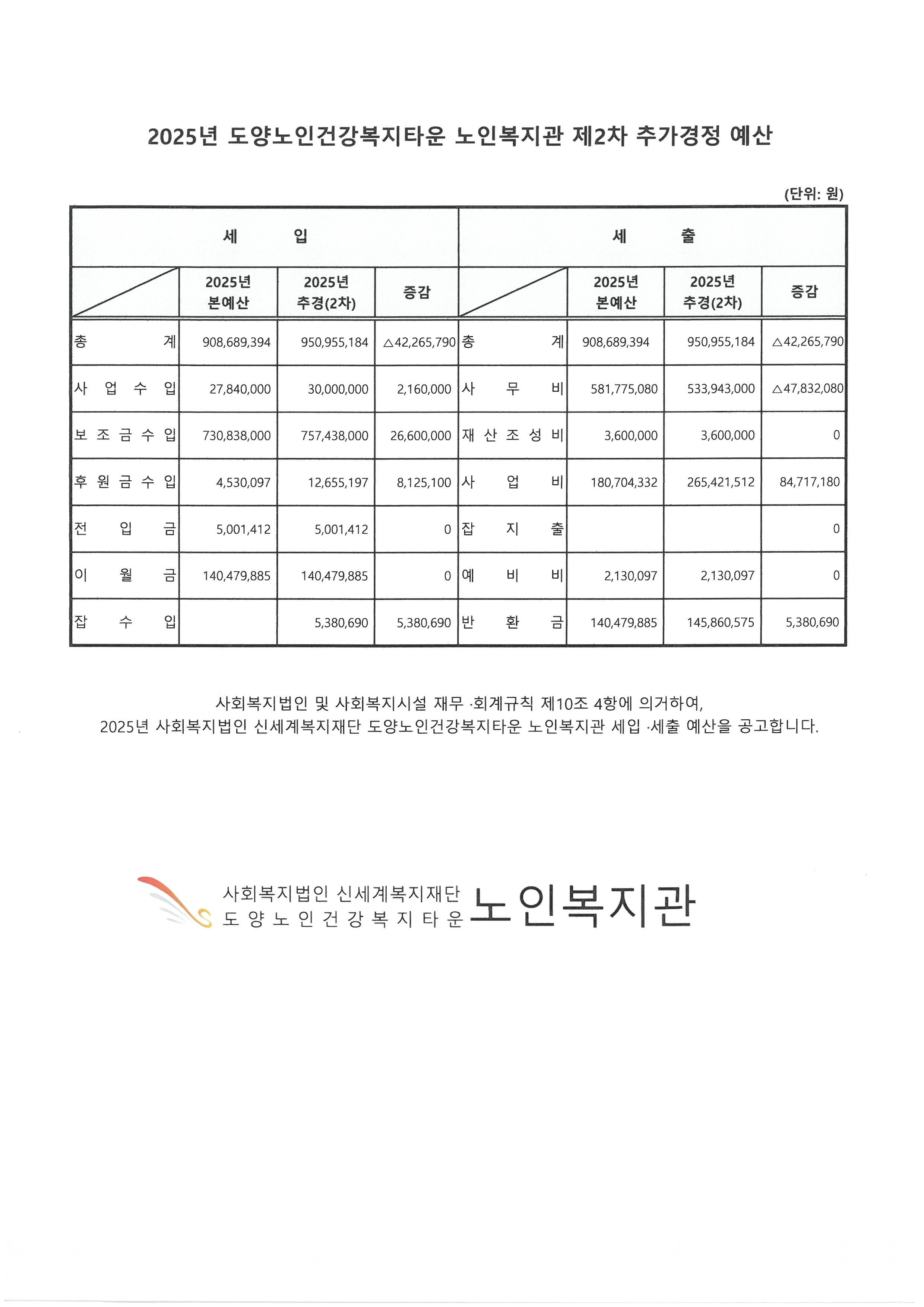 2025년 도양노인건강복지타운 노인복지관 2차 추가경정 예산(안) 공고