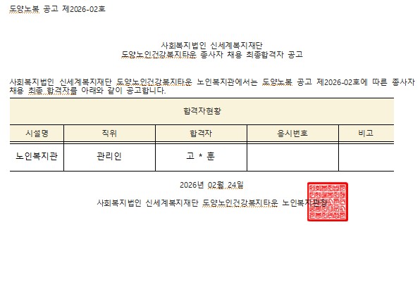 사회복지법인신세계복지재단 도양노인건강복지타운노인복지관 관리인 최종 합격자 공고