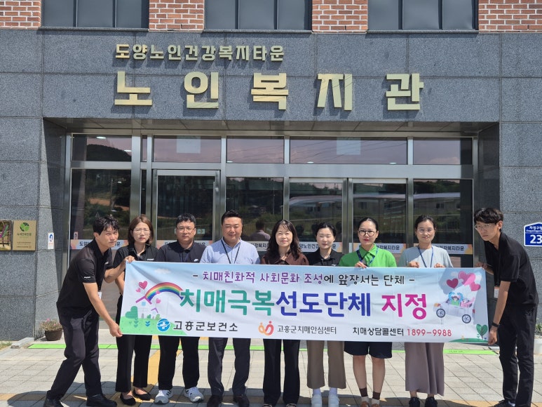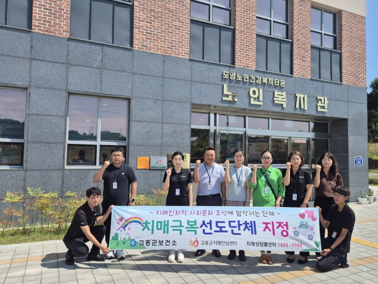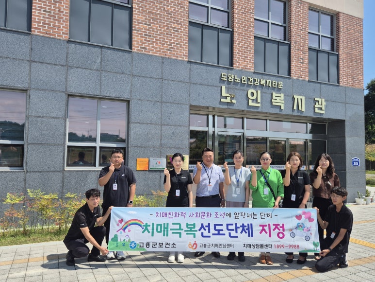 도양노인건강복지타운 노인복지관은 중앙치매센터, 전라남도광역치매센터, 고흥군치매안심센터가 추진하는 치매 관련 교육에 적극 참여하며 치매극복 활동에 동참해왔습니다. 그 노력의 결실로, 2025년 7월 31일 「치매극복선도단체」로 지정되었습니다. 앞으로도 도양노인건강복지타운 노인복지관은 지역사회와 함께 치매에 대한 올바른 이해를 돕고, 치매 친화적 사회문화 조성에 더욱 힘쓰겠습니다. 감사합니다.