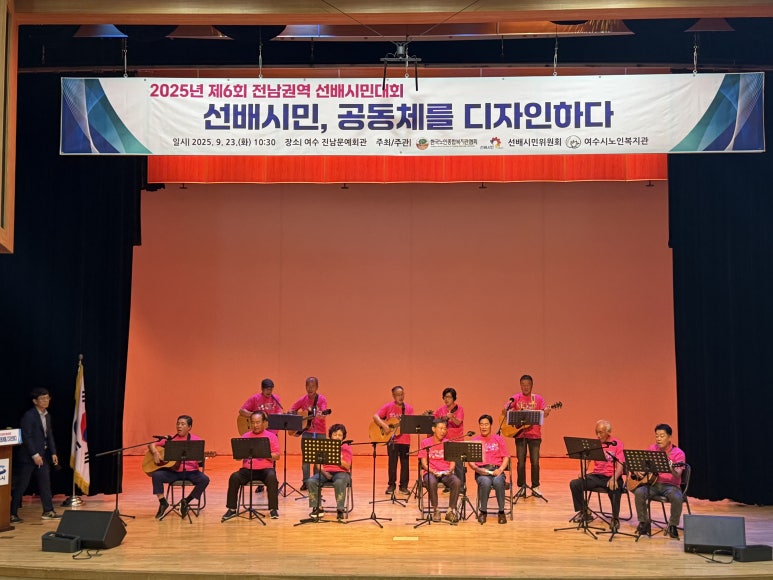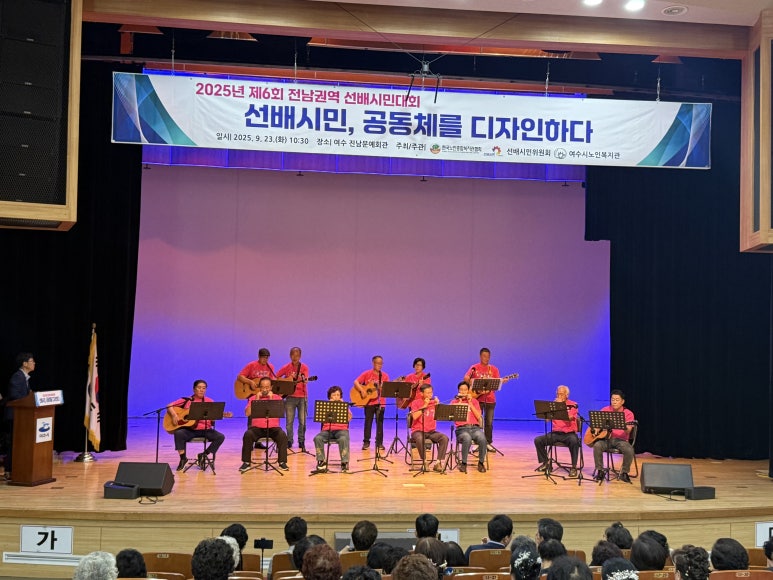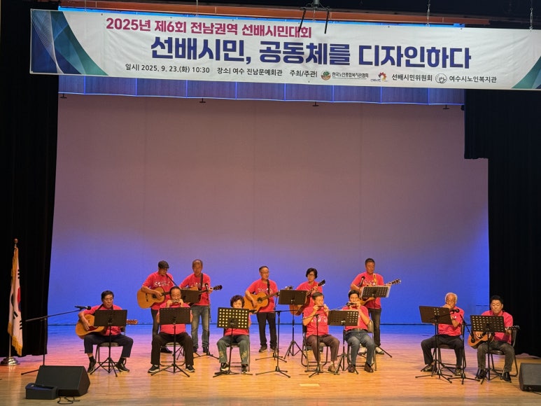 2025년 9월 23일, 도양노인건강복지타운은 ‘2025년 제6회 전남권역 선배시민대회’에 참석해 복지관 어르신들의 통기타와 하모니카 합주 공연을 선보였습니다. ‘엄마야 누나야’, ‘장미’, ‘오동잎’ 총 3곡을 연주하며 노년사회화교육 프로그램에서 갈고 닦은 실력을 마음껏 발휘했습니다. 어르신들의 공연으로 현장 분위기가 한층 더 활기찼습니다. 이번 공연은 어르신들께서 문화와 여가 활동에 참여해 자신감을 되찾고 활기찬 일상을 보내는 소중한 시간이었습니다. 앞으로도 도양노인복지타운 노인복지관은 어르신들께서 참여할 수 있는 다양한 프로그램을 제공하고, 복지관 활성화와 지역사회 소통을 위해 힘쓰겠습니다.