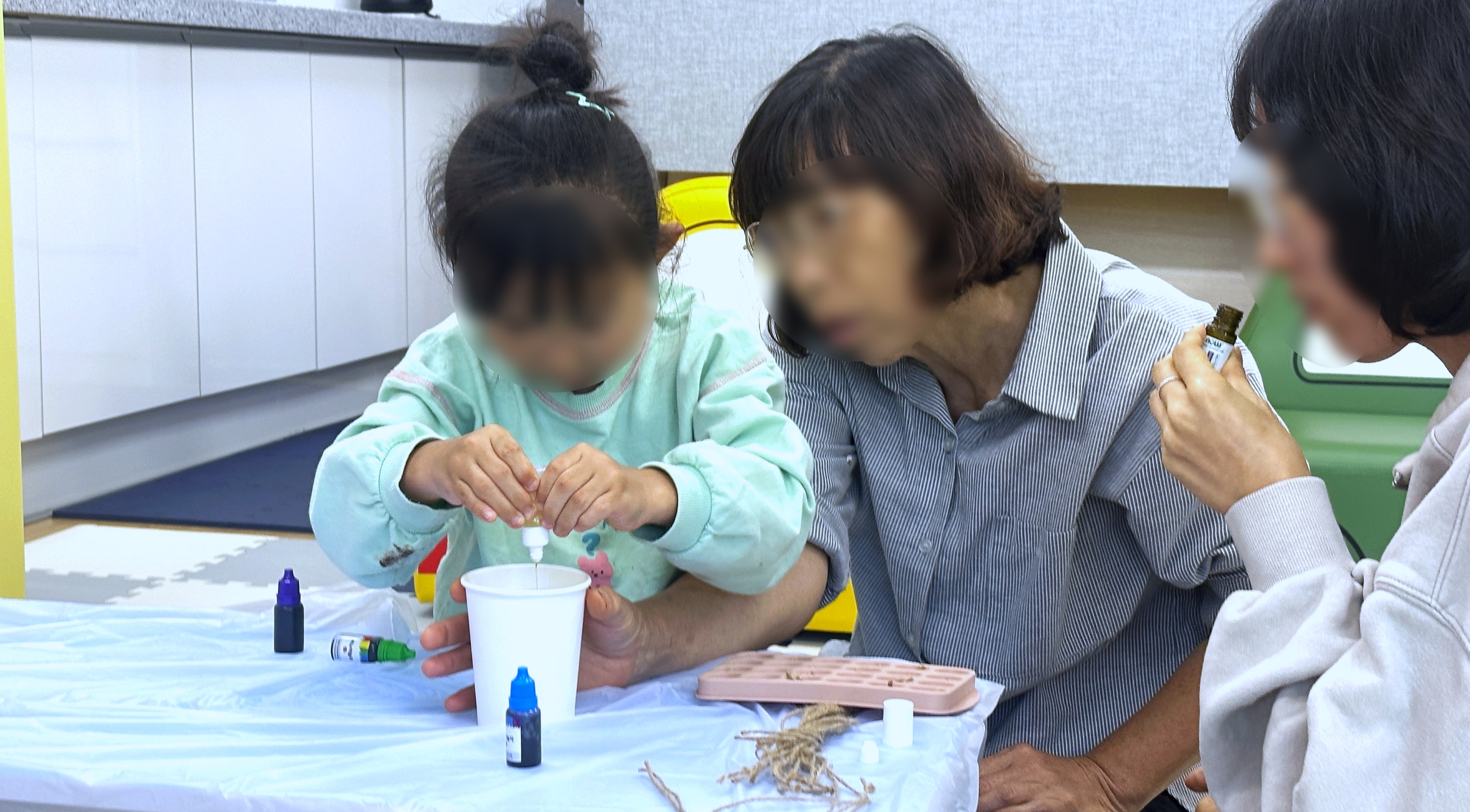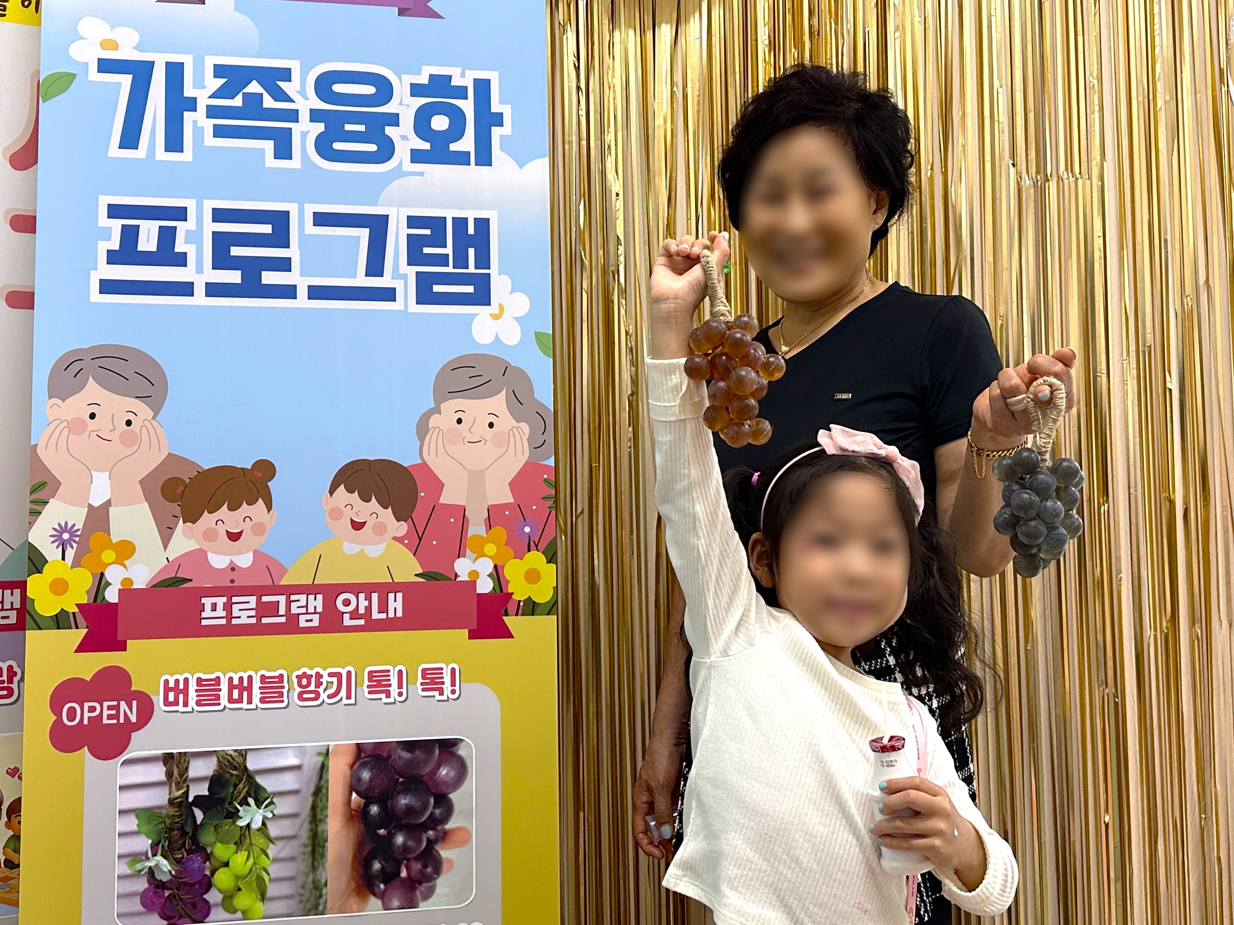 조부모님과 손자녀가 함께 비누 베이스를 녹이고 색과 향을 섞어 포도송이 모양의 비누를 직접 만들며 즐겁고 향기로운 시간을 보냈습니다.