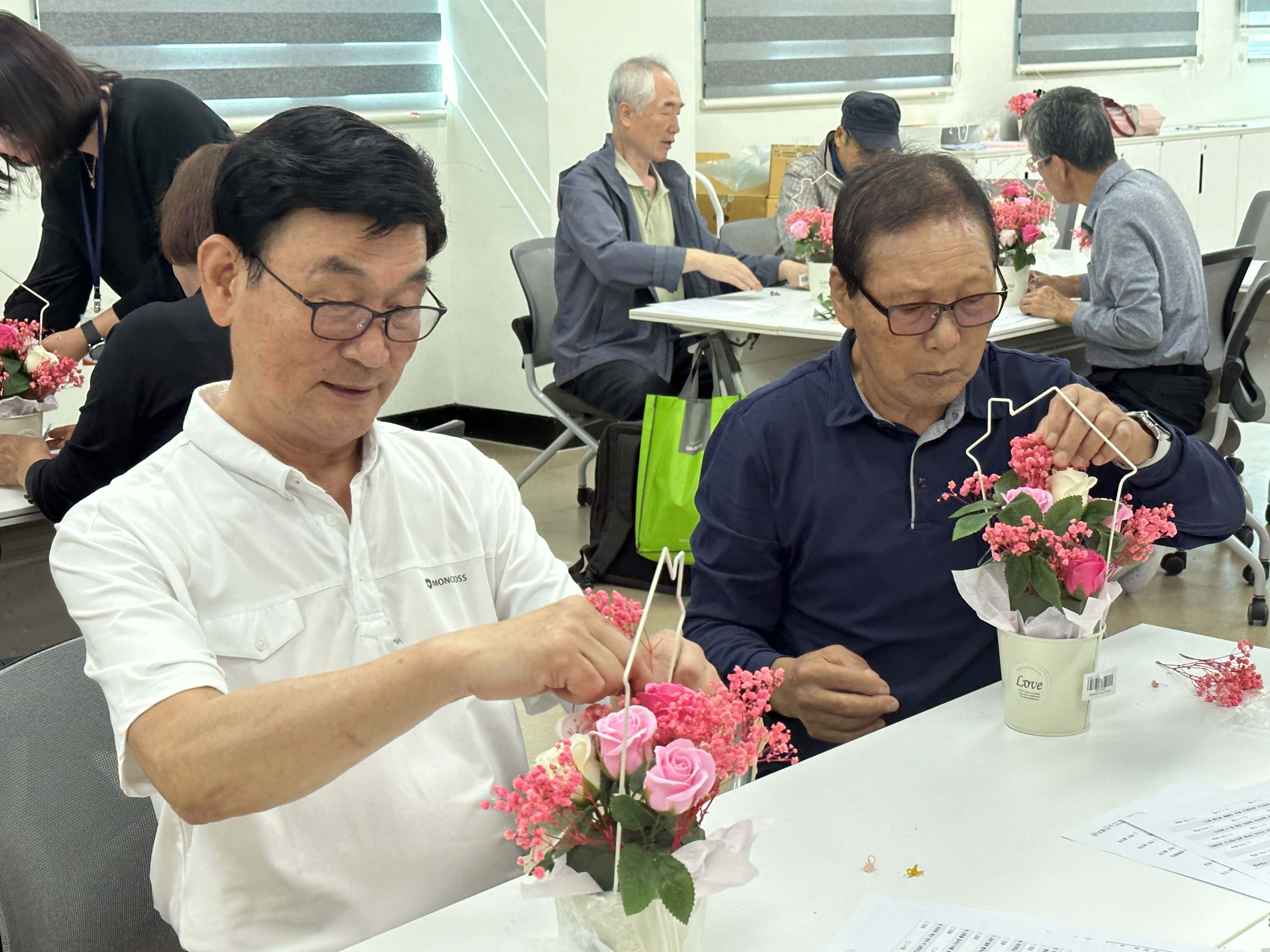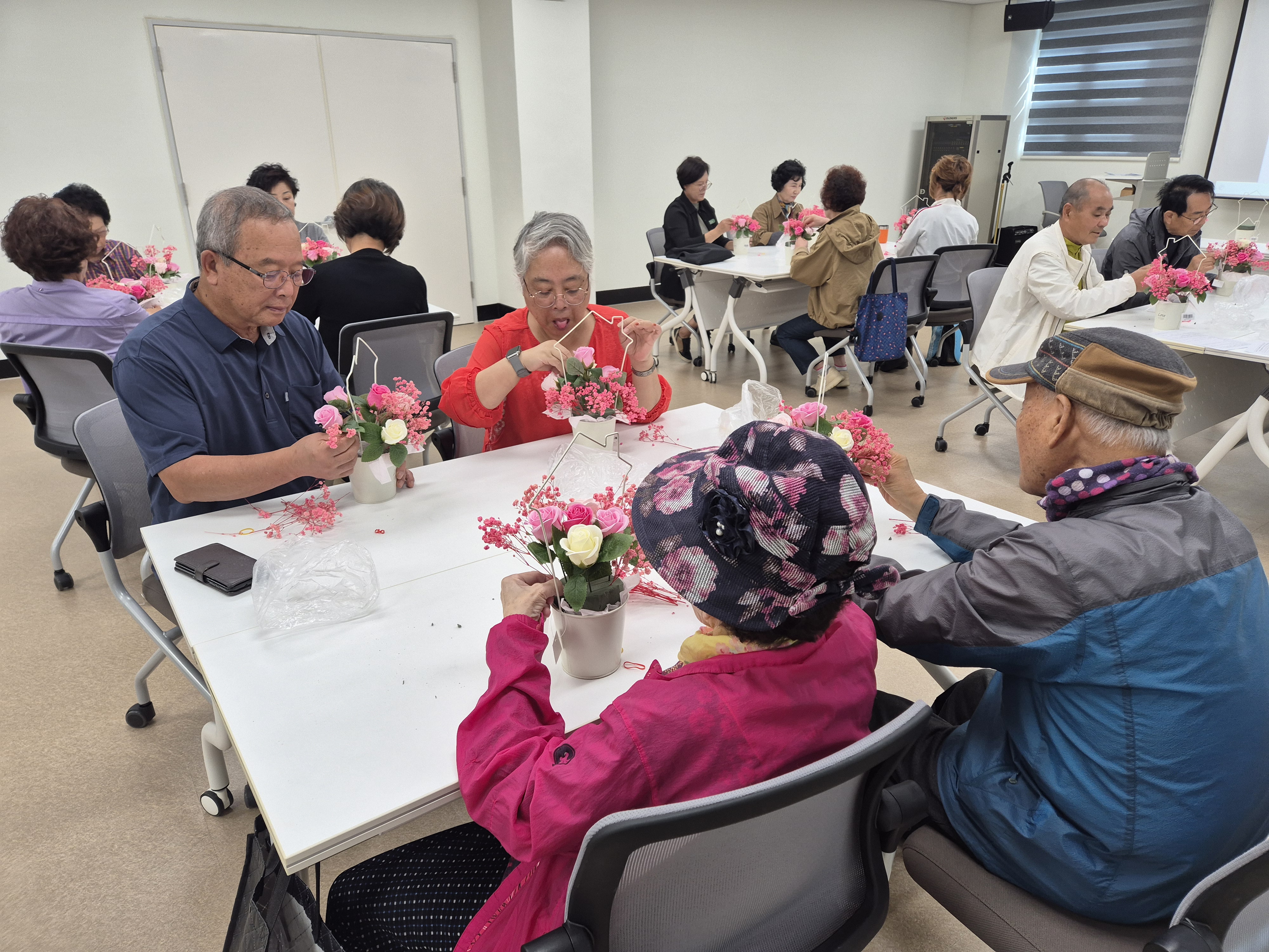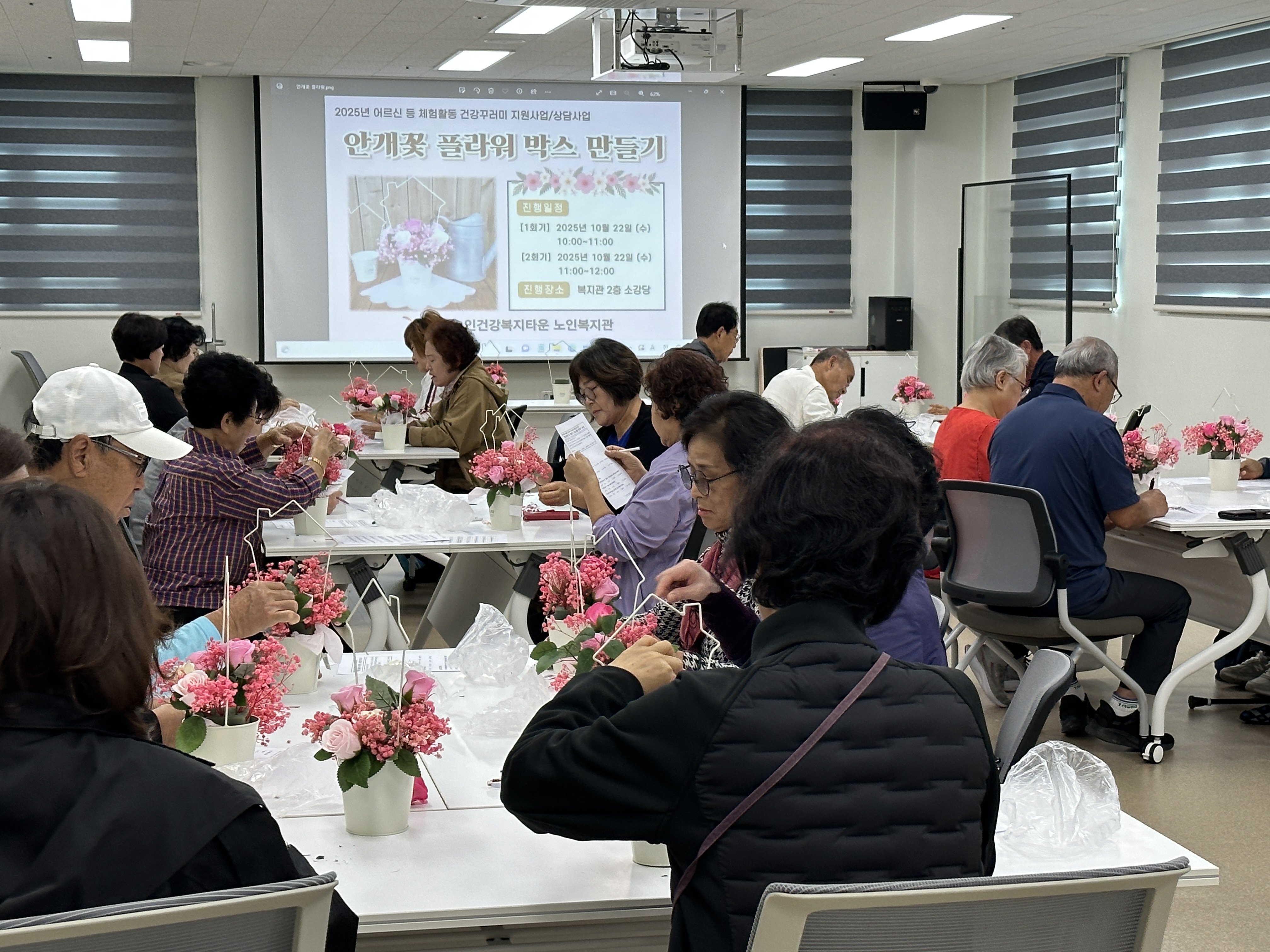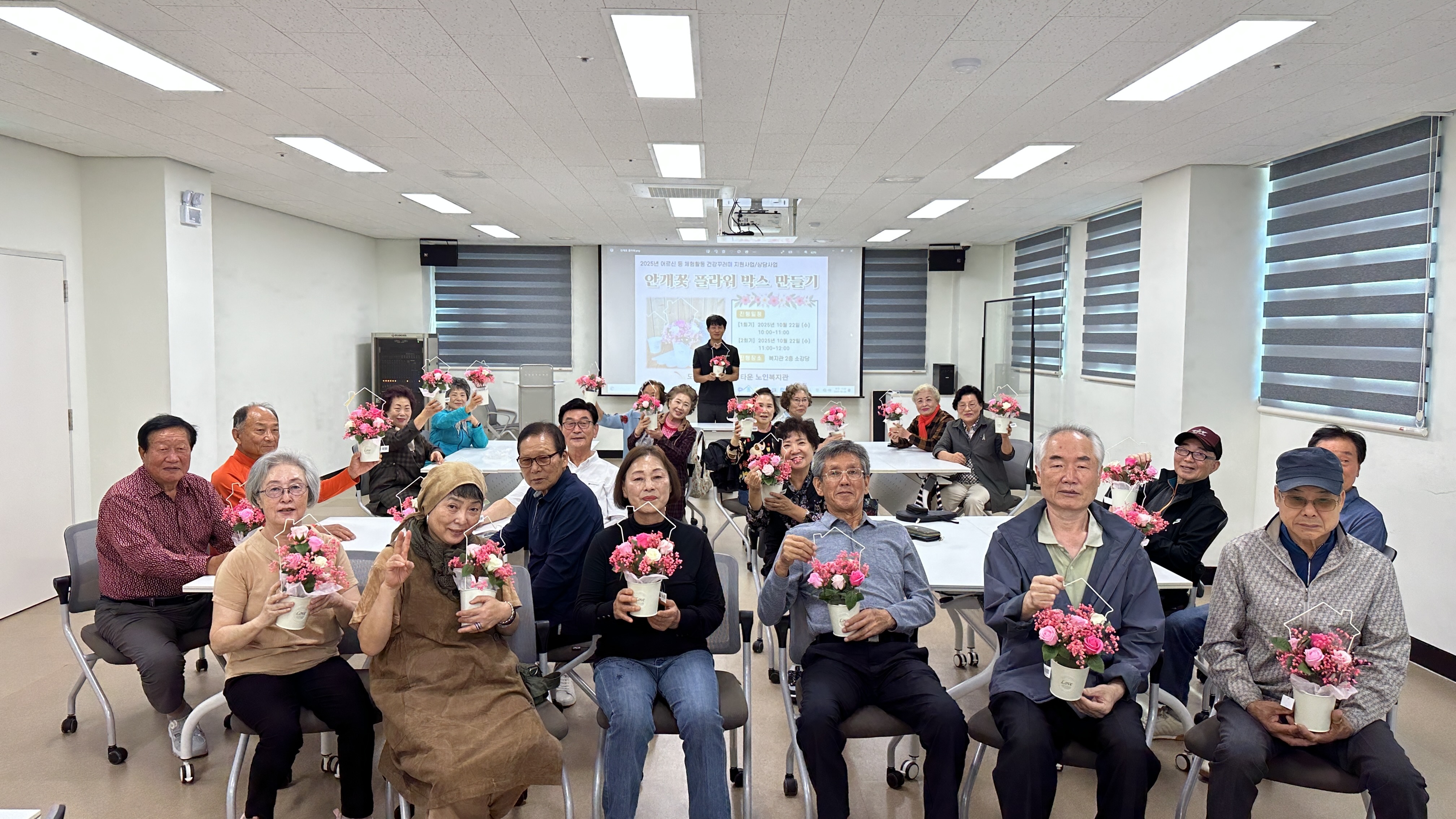 2025년 10월 22일(수) 도양노인건강복지타운 노인복지관은 고흥군 농업정책과의 2025년 어르신 건강체험활동 꾸러미 지원사업에 선정되어 10월 프로그램으로 ‘안개꽃 플라워 박스 만들기’ 체험 및 집단상담을 진행하였습니다. 이번 프로그램은 2회기에 걸쳐 복지관 이용 어르신 60명이 참여하셨으며, 안개꽃 플라워 박스 만들기 체험과 함께 진행된 집단상담을 통해 서로의 경험을 나누고 따뜻한 소통의 시간을 가졌습니다. 체험활동과 집단상담은 어르신들의 정서적 안정과 유대감 형성, 그리고 건강 증진에도 큰 도움이 되는 시간이었습니다. 앞으로도 도양노인건강복지타운 노인복지관은 어르신들께 다양한 프로그램 참여 기회를 제공하고, 신체적ㆍ정신적 건강 향상에 도움이 될 수 있도록 최선을 다하겠습니다. 감사합니다.