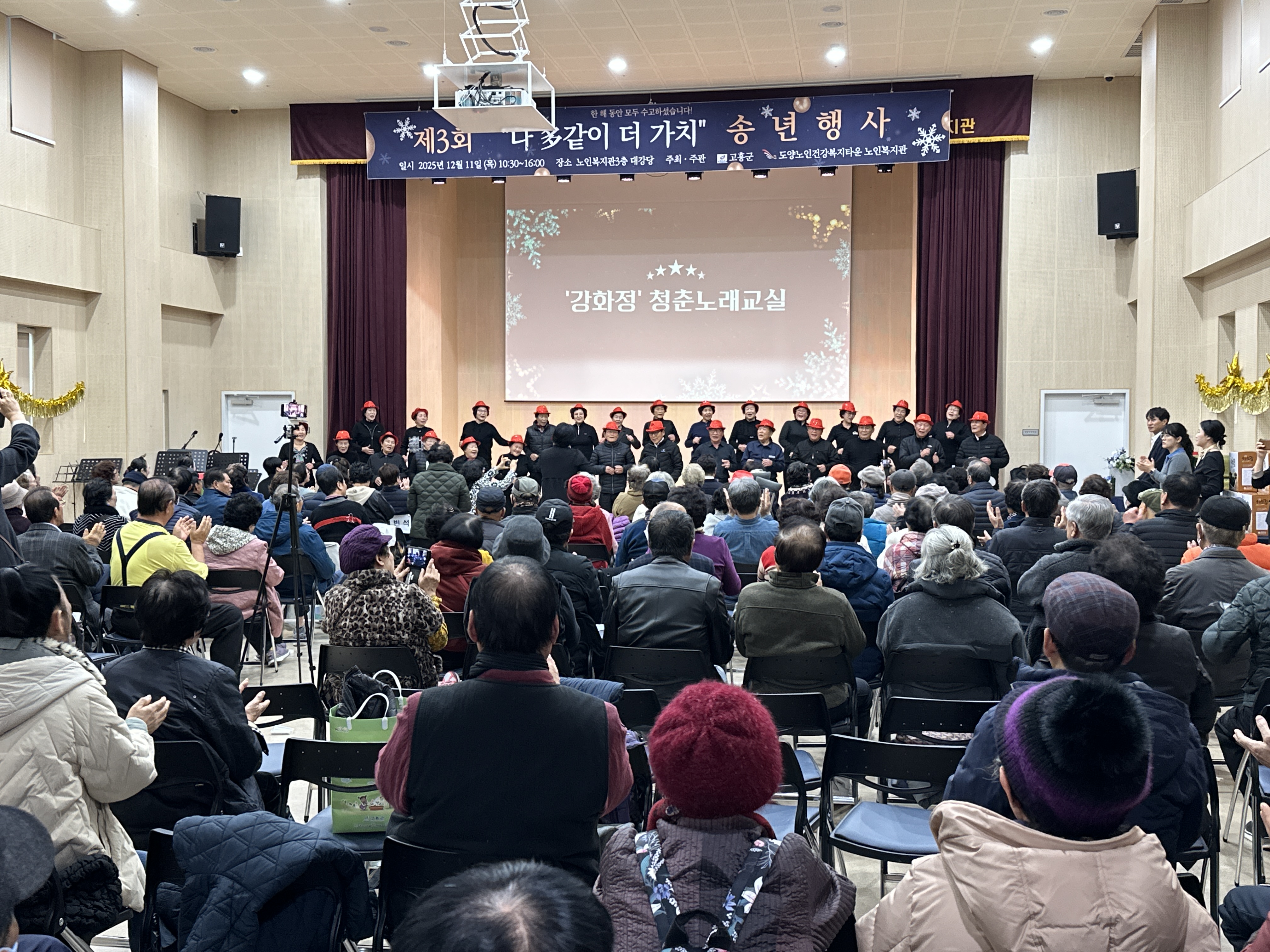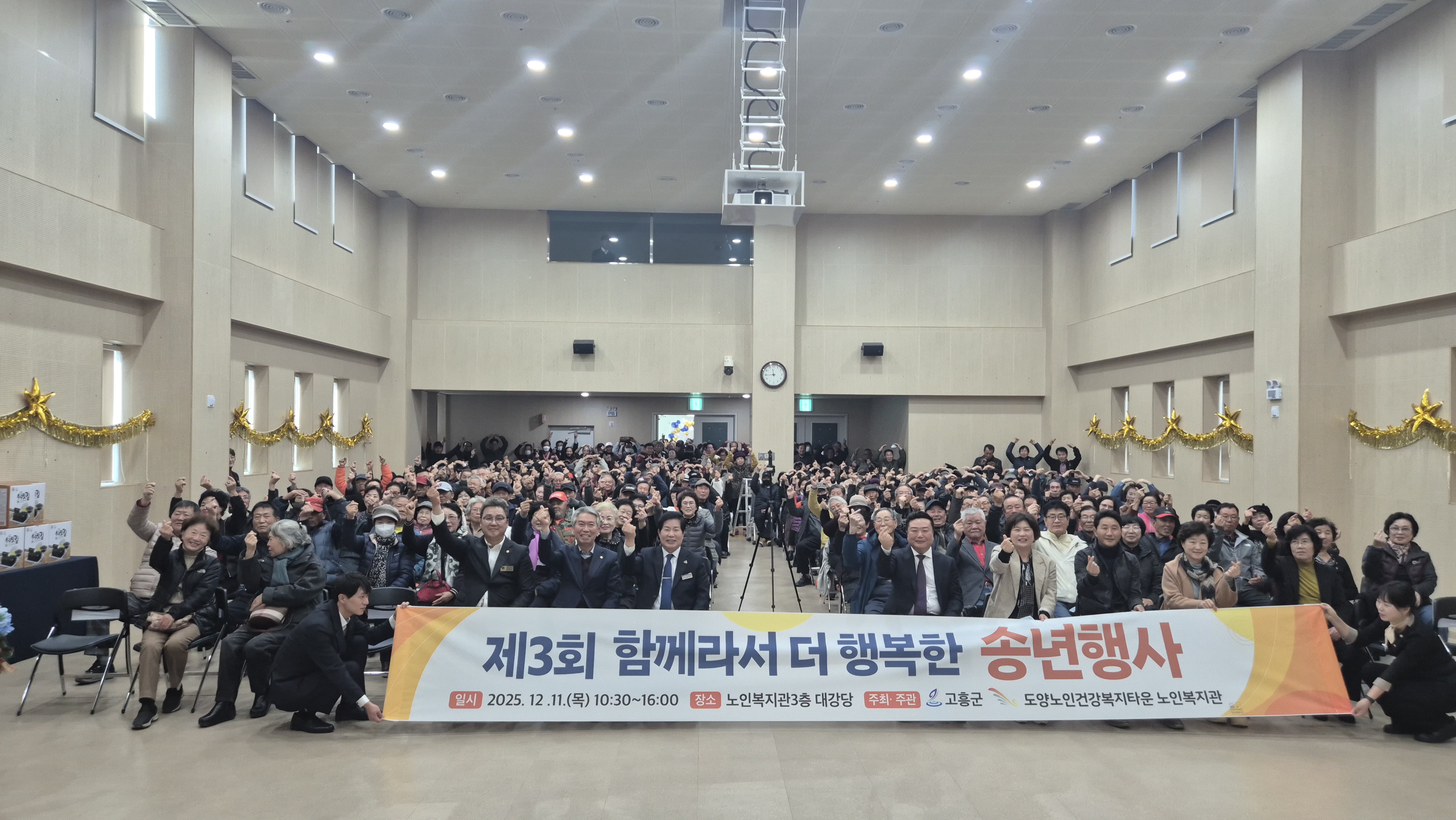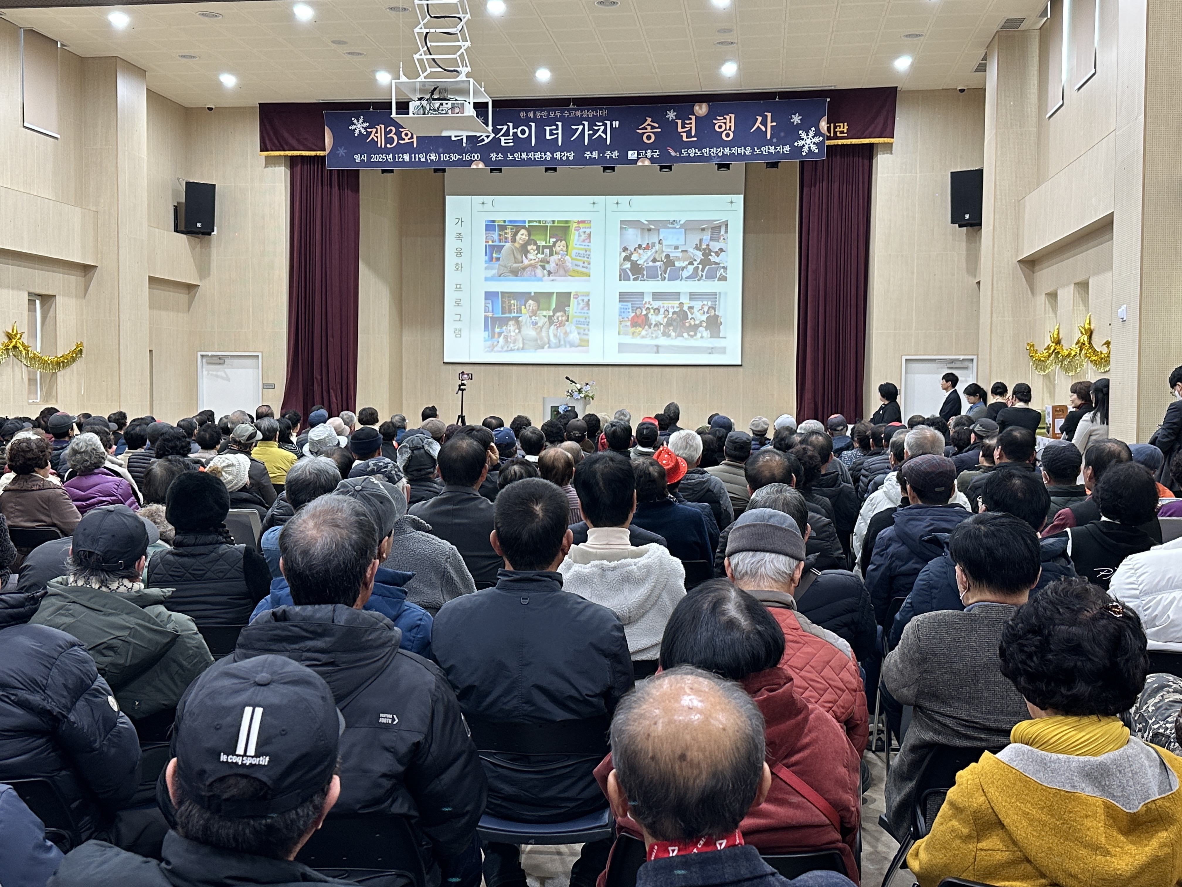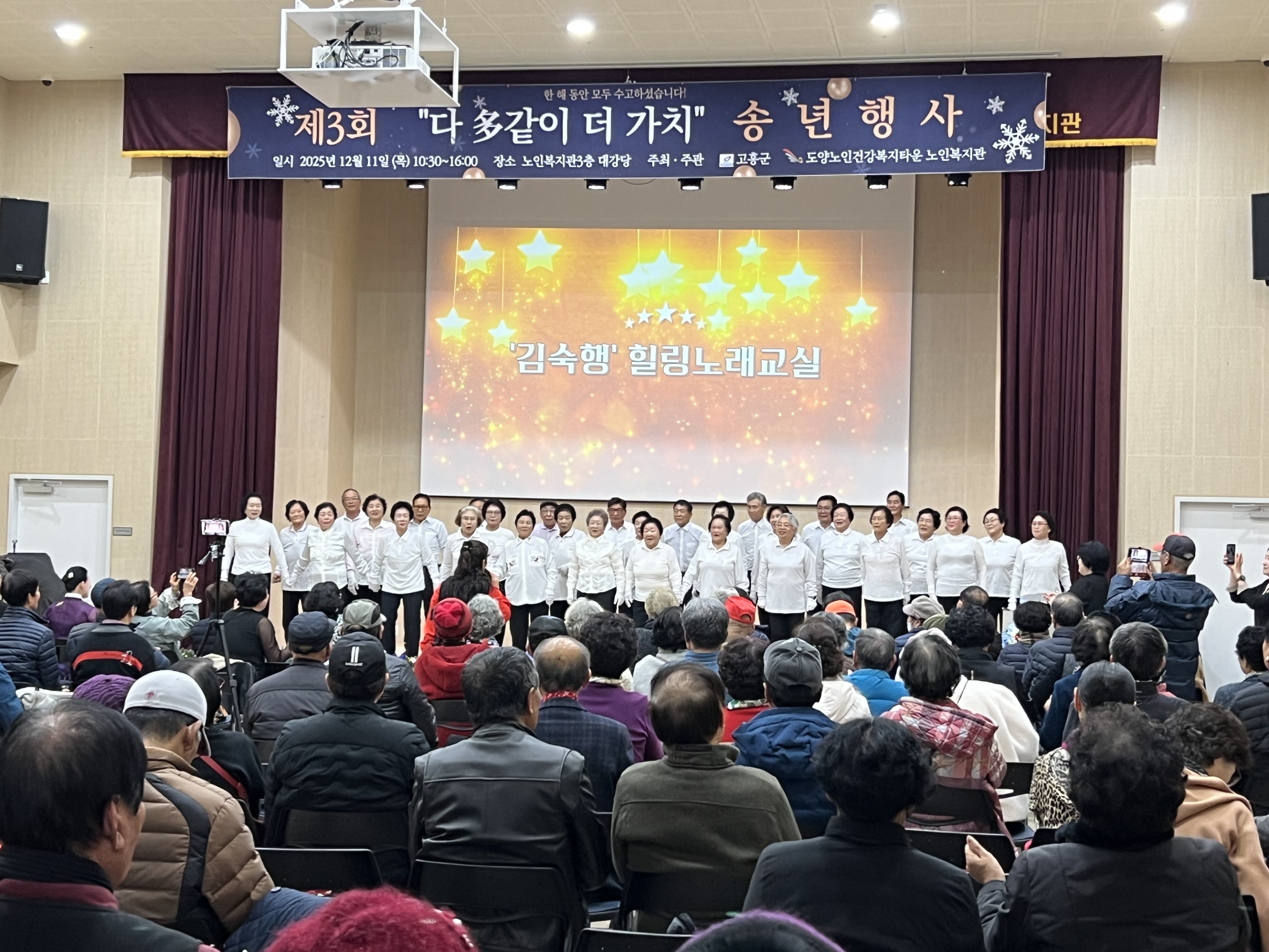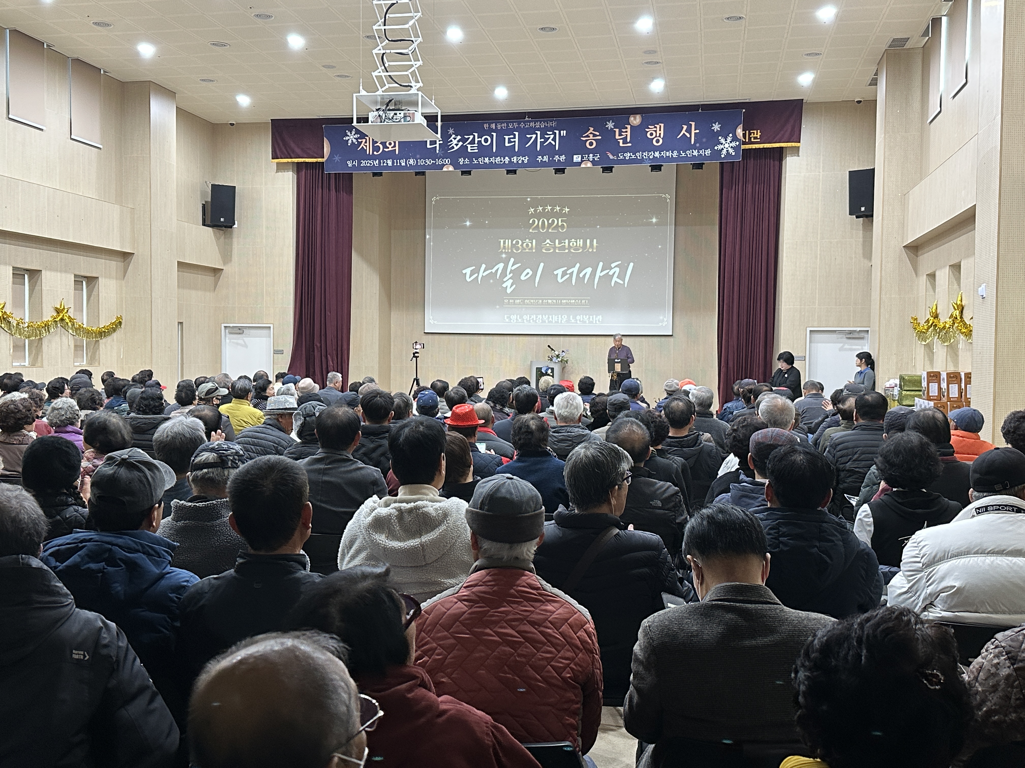 “도양노인건강복지타운 노인복지관, 320여 명 참여 속 송년행사 성황리 개최” 2025년 12월 12일(목), 도양노인건강복지타운 노인복지관에서는 제3회 2025년 다多같이 더가치 송년행사를 성황리에 개최했습니다. 이날 행사에는 복지관을 이용하시는 어르신들을 비롯해 후원자, 자원봉사자, 군수님을 포함한 내빈 및 지역주민 등 약 320여 명이 참석하여 뜻깊은 시간을 함께했습니다. 이번 송년행사는 한 해 동안 복지관 프로그램에 참여하며 적극적으로 활동해 주신 어르신들의 노고에 감사의 마음을 전하고, 그동안의 성과를 함께 나누기 위해 마련됐습니다.