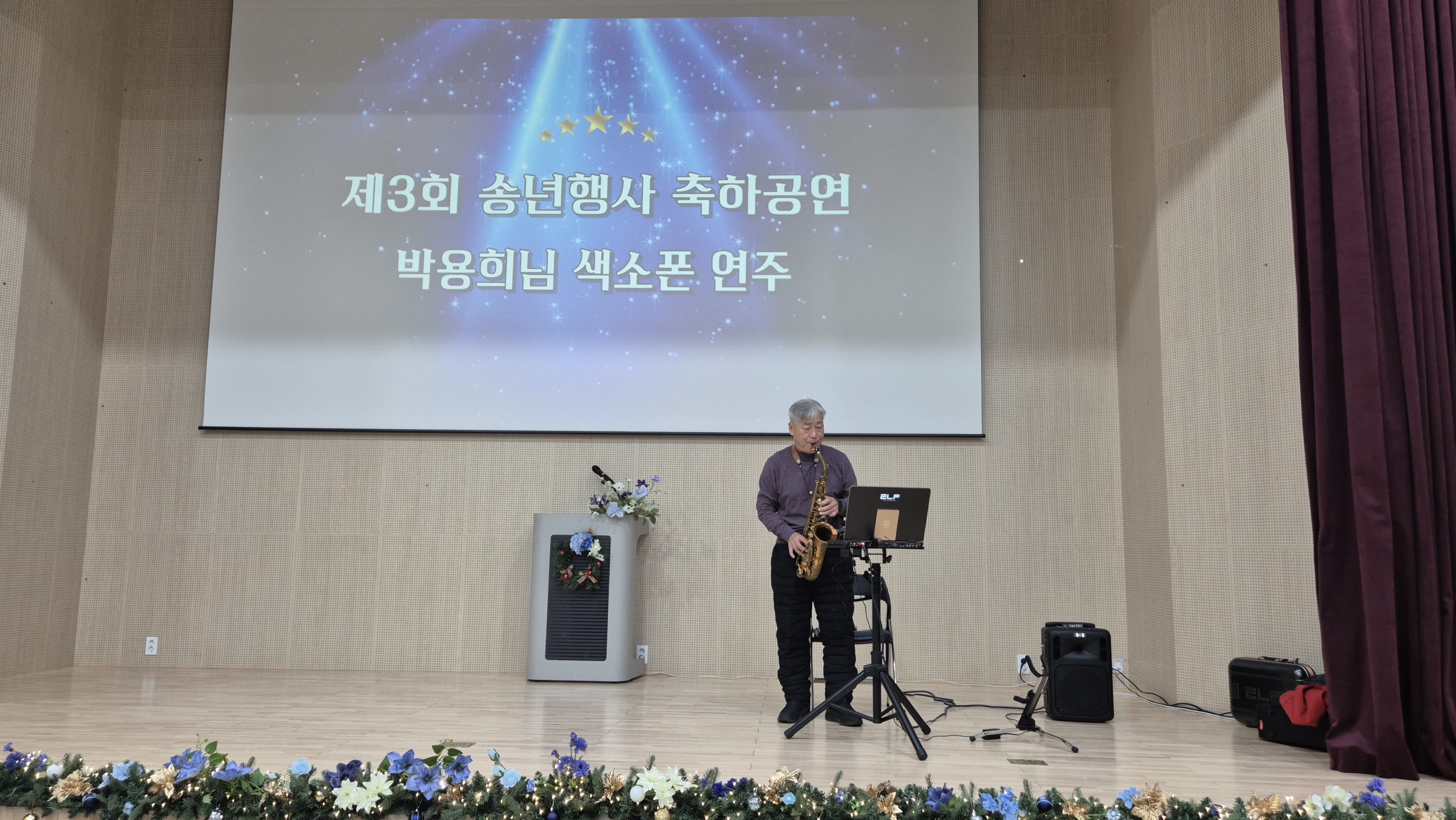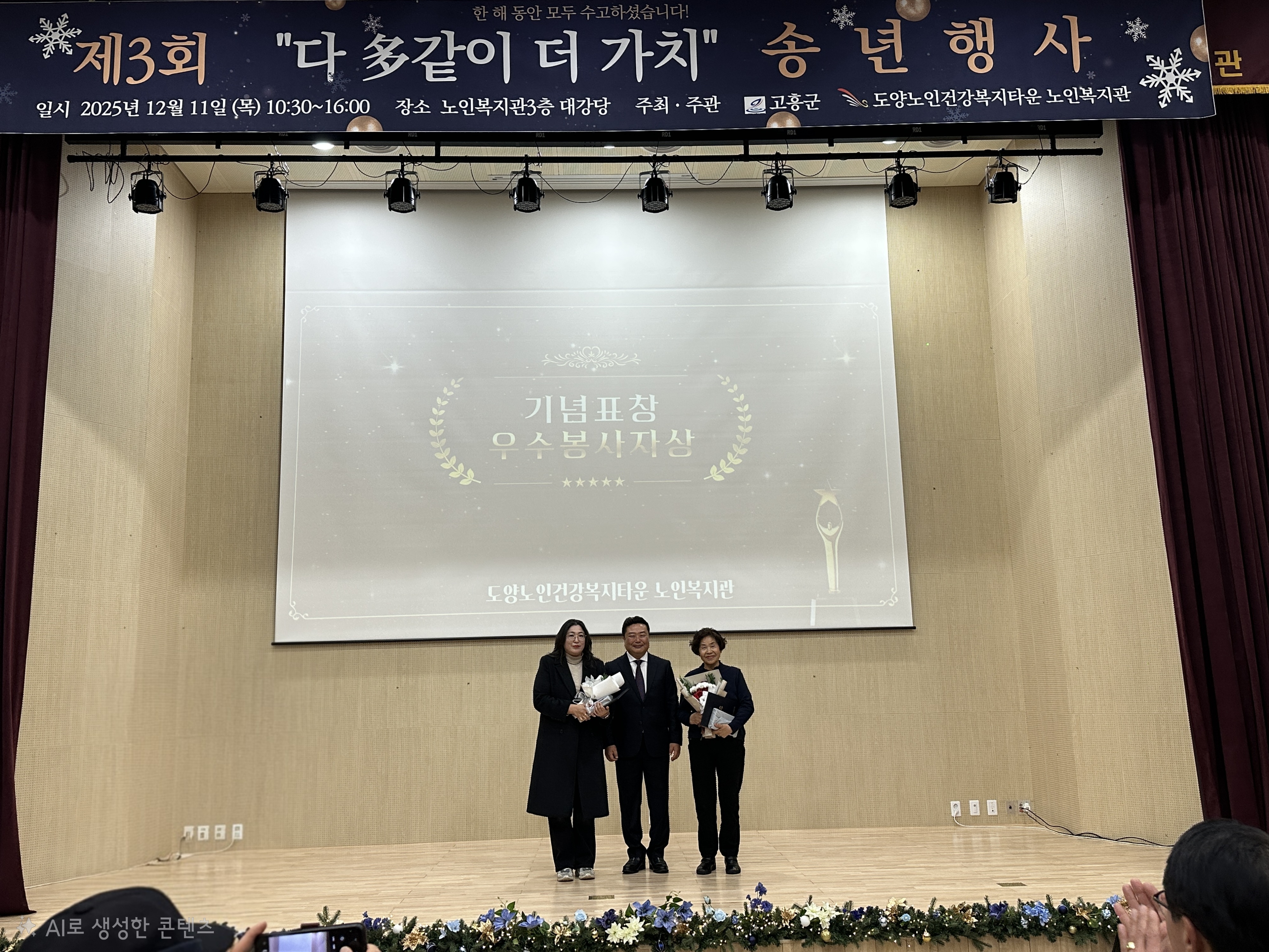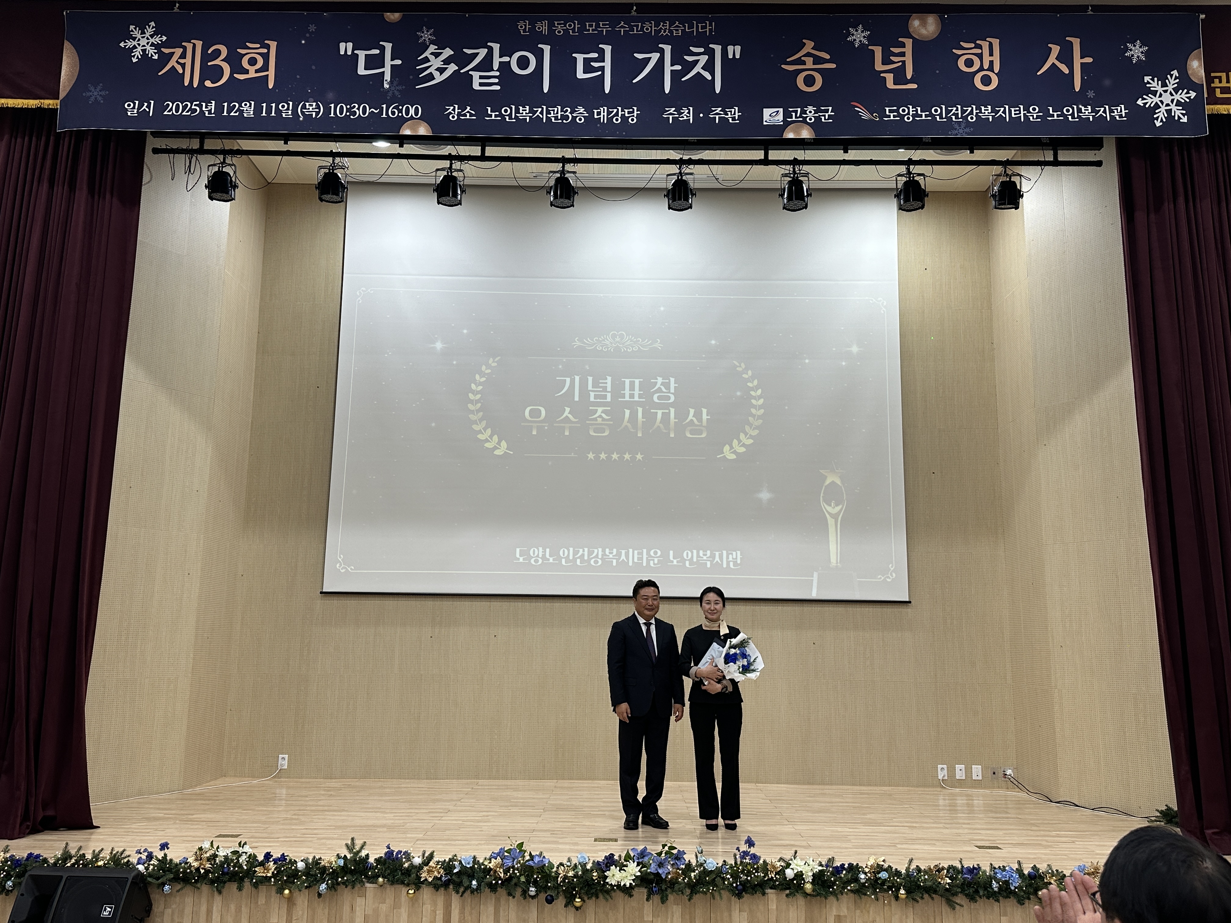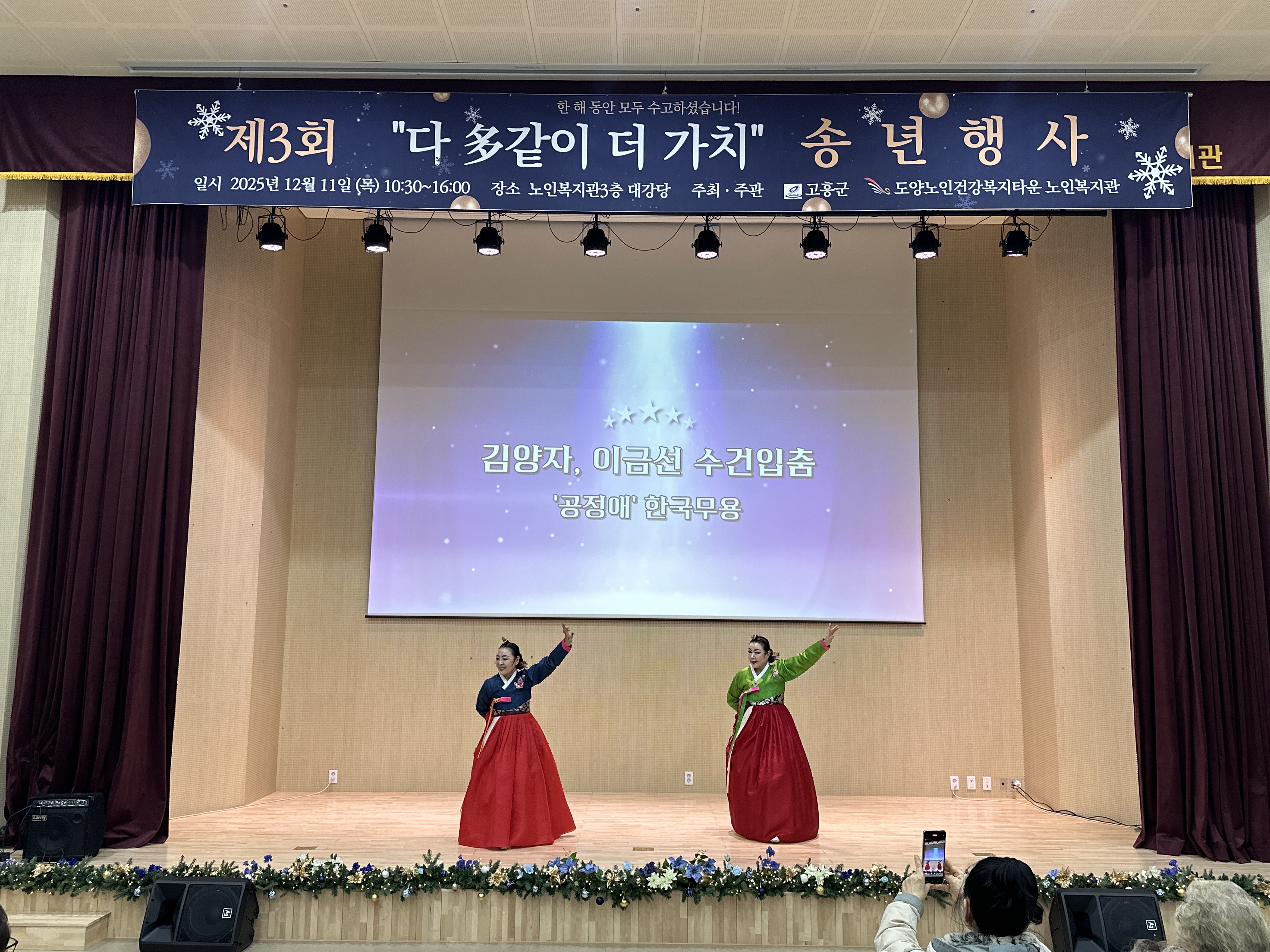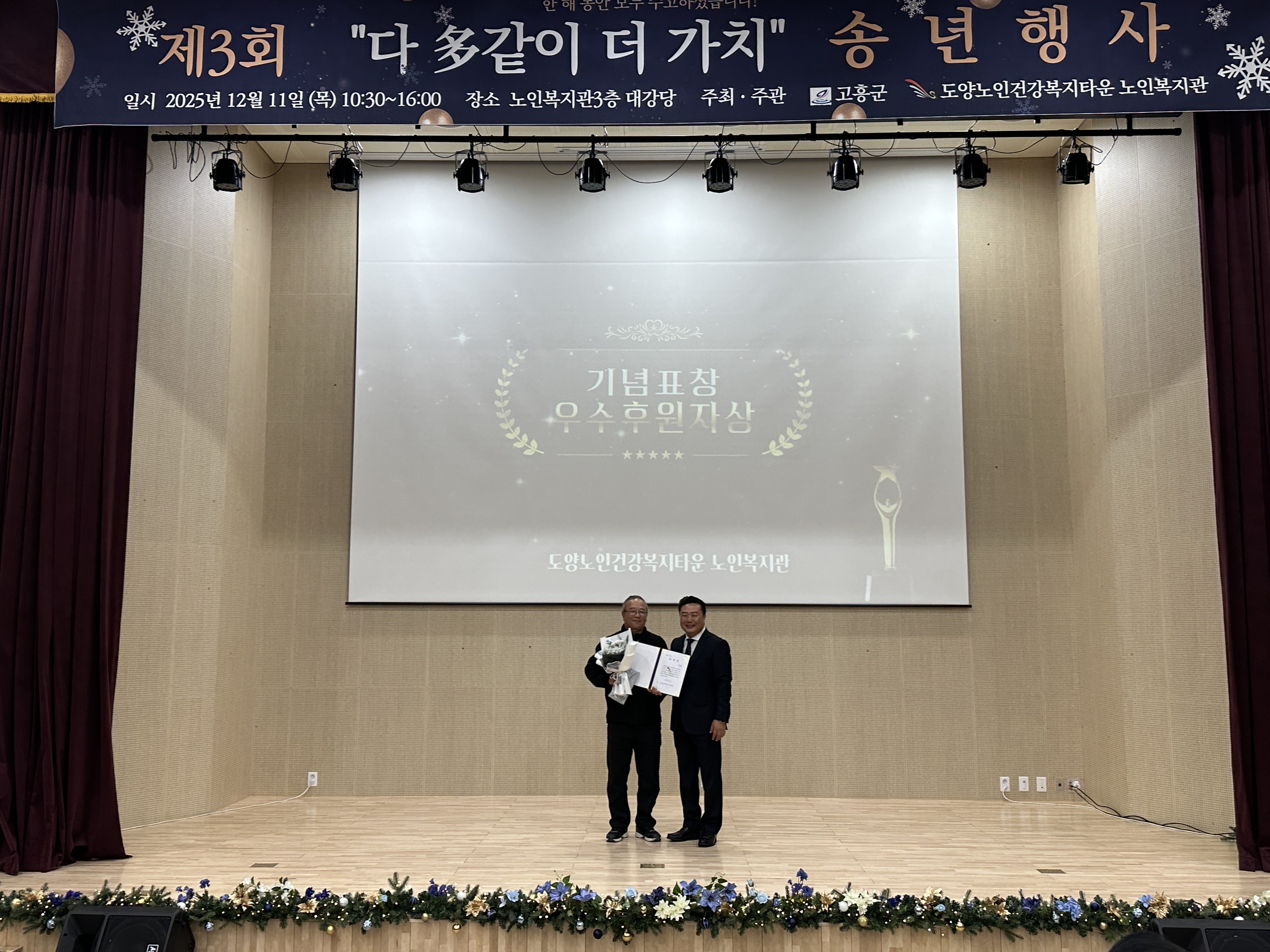 “도양노인건강복지타운 노인복지관, 320여 명 참여 속 송년행사 성황리 개최” 2025년 12월 12일(목), 도양노인건강복지타운 노인복지관에서는 제3회 2025년 다多같이 더가치 송년행사를 성황리에 개최했습니다. 이날 행사에는 복지관을 이용하시는 어르신들을 비롯해 후원자, 자원봉사자, 군수님을 포함한 내빈 및 지역주민 등 약 320여 명이 참석하여 뜻깊은 시간을 함께했습니다. 이번 송년행사는 한 해 동안 복지관 프로그램에 참여하며 적극적으로 활동해 주신 어르신들의 노고에 감사의 마음을 전하고, 그동안의 성과를 함께 나누기 위해 마련됐습니다.