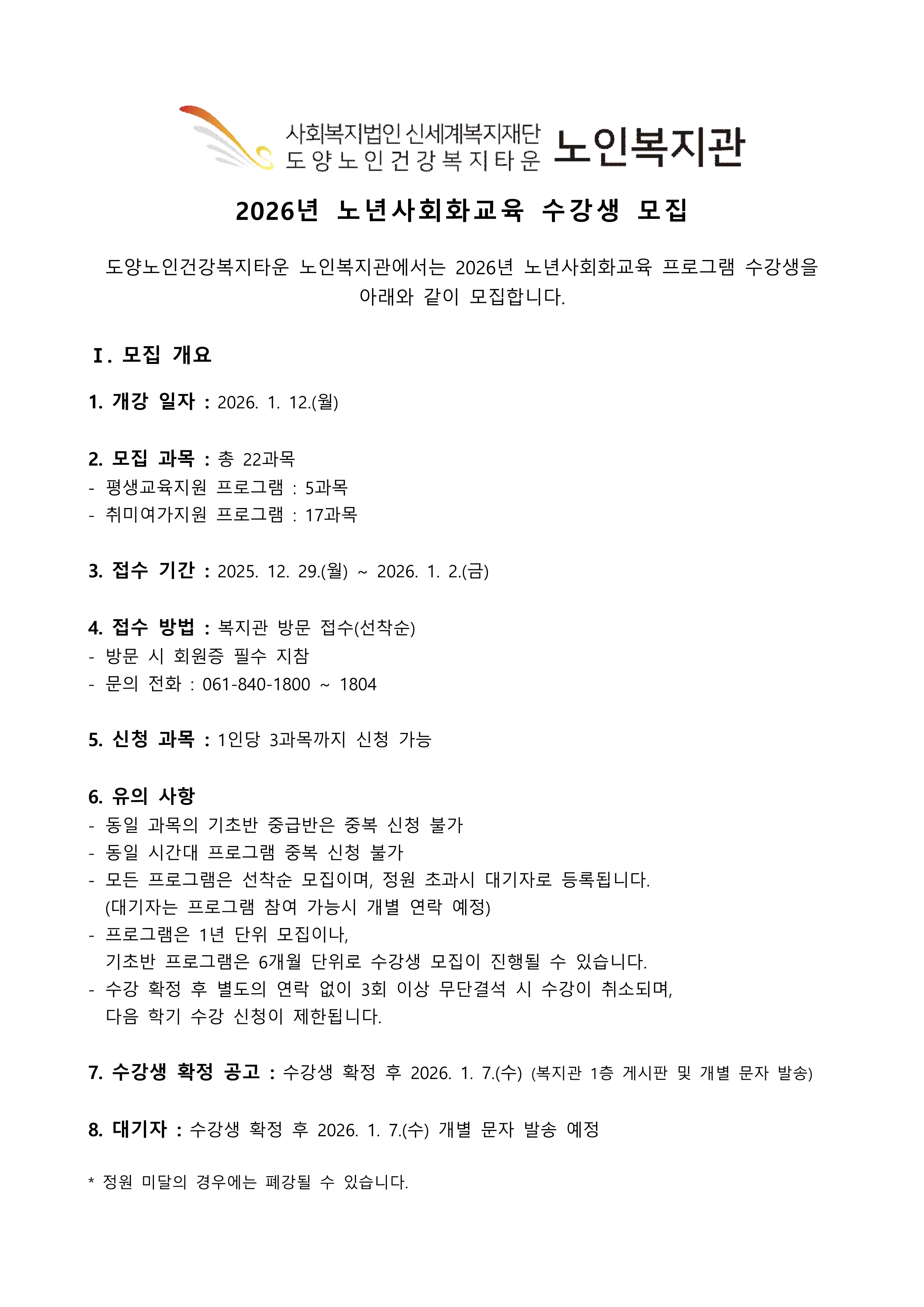 도양노인건강복지타운 노인복지관에서 알려드리는 공지사항입니다.