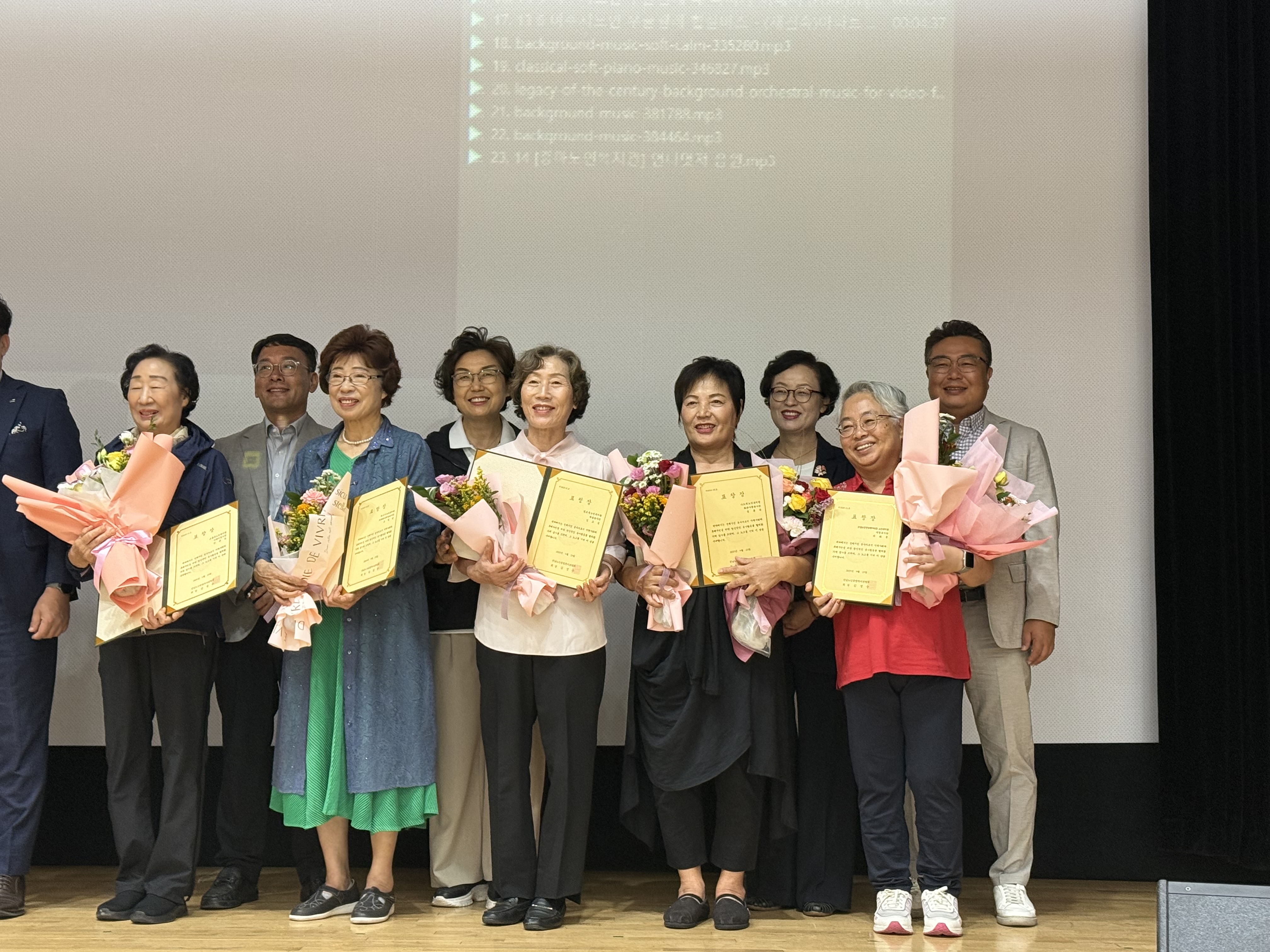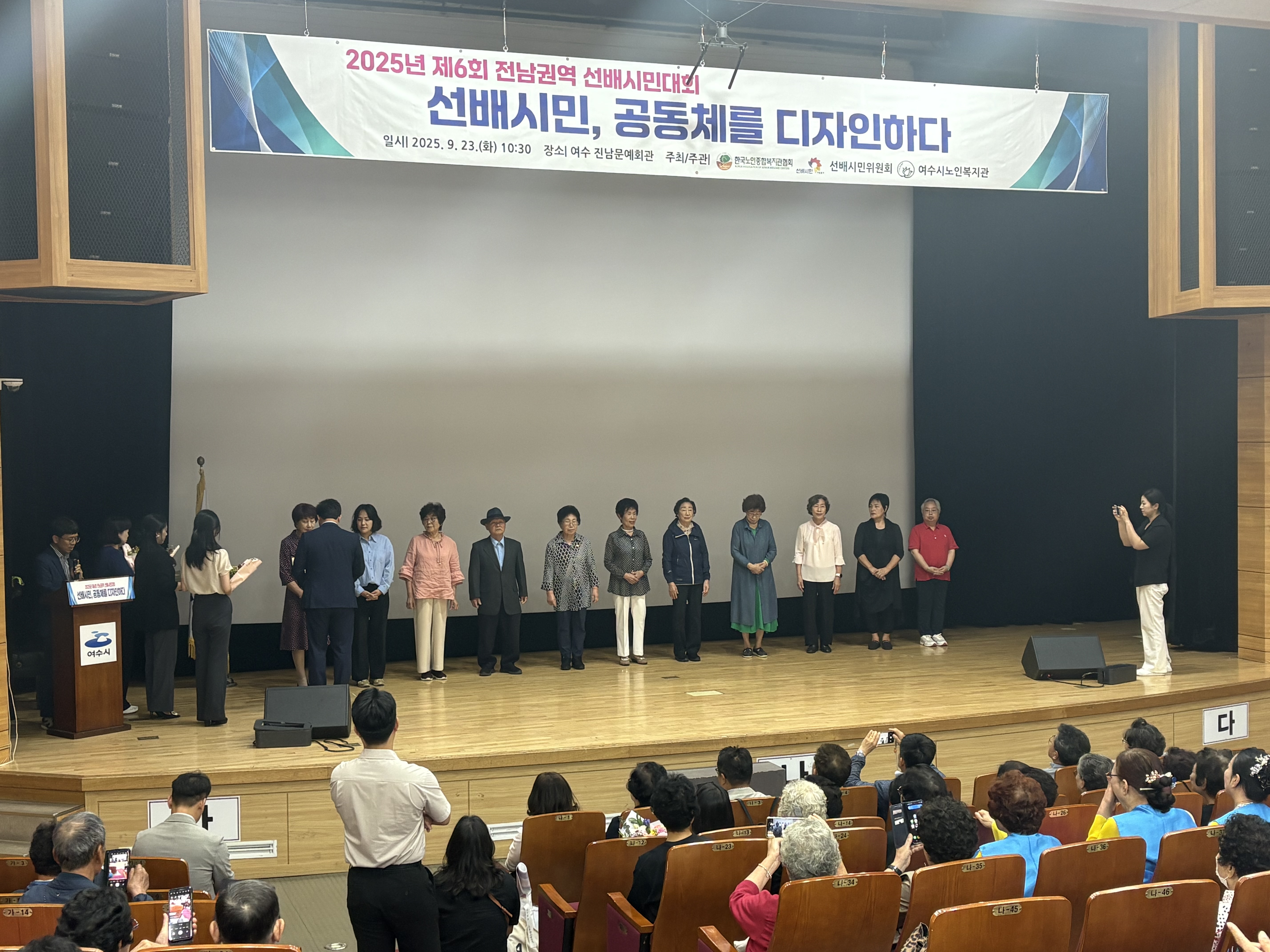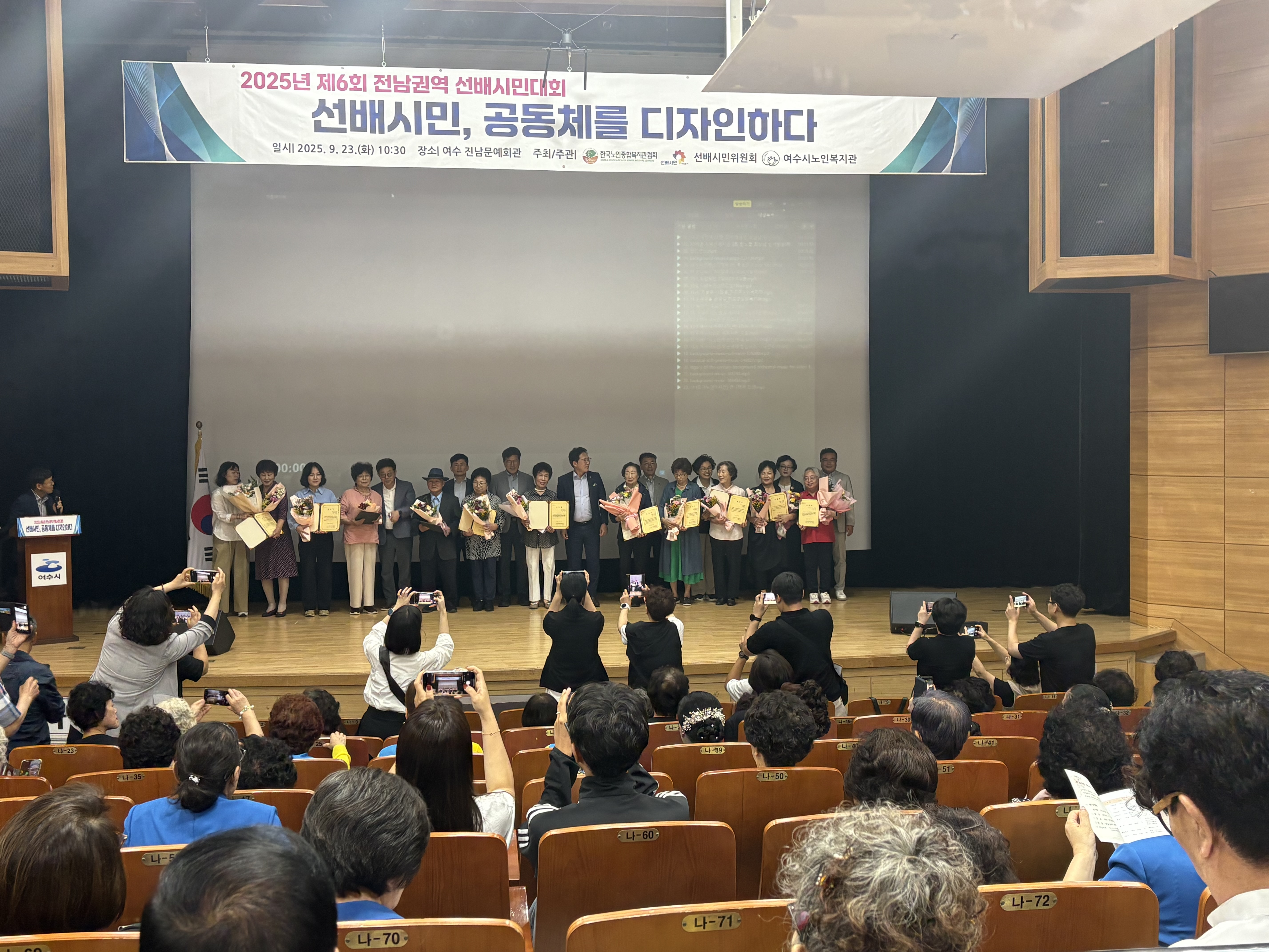 도양노인건강복지타운 노인복지관에서는 2025년 9월 19일 여수 진남문예회관에서 진행된 ‘2025년 전남권역 선배시민자원봉사단 지역대회’에 참여하여 전남 11개기관에서 모인 선배시민 150여명과 임직원이 함께 지역사회 속 선배시민 자원봉사 활동의 가치를 나누고 교류하는 뜻깊은 시간을 가졌습니다. 본 복지관에서는 최화훈 어르신이 전남노인종합복지관협회장 표창을 수상하여 모범적인 선배시민의 모습을 보여주셨습니다. 또한 노고지리봉사단이 통기타와 하모니카 연주를 선보이며 참석자들에게 따뜻한 울림과 즐거움을 전해주었습니다. 앞으로도 도양노인건강복지타운 노인복지관은 선배시민들의 활약을 적극적으로 지원하며, 지역사회속에서 어르신들이 주체적으로 참여하고 성장할 수 있는 환경을 만들어 가겠습니다.