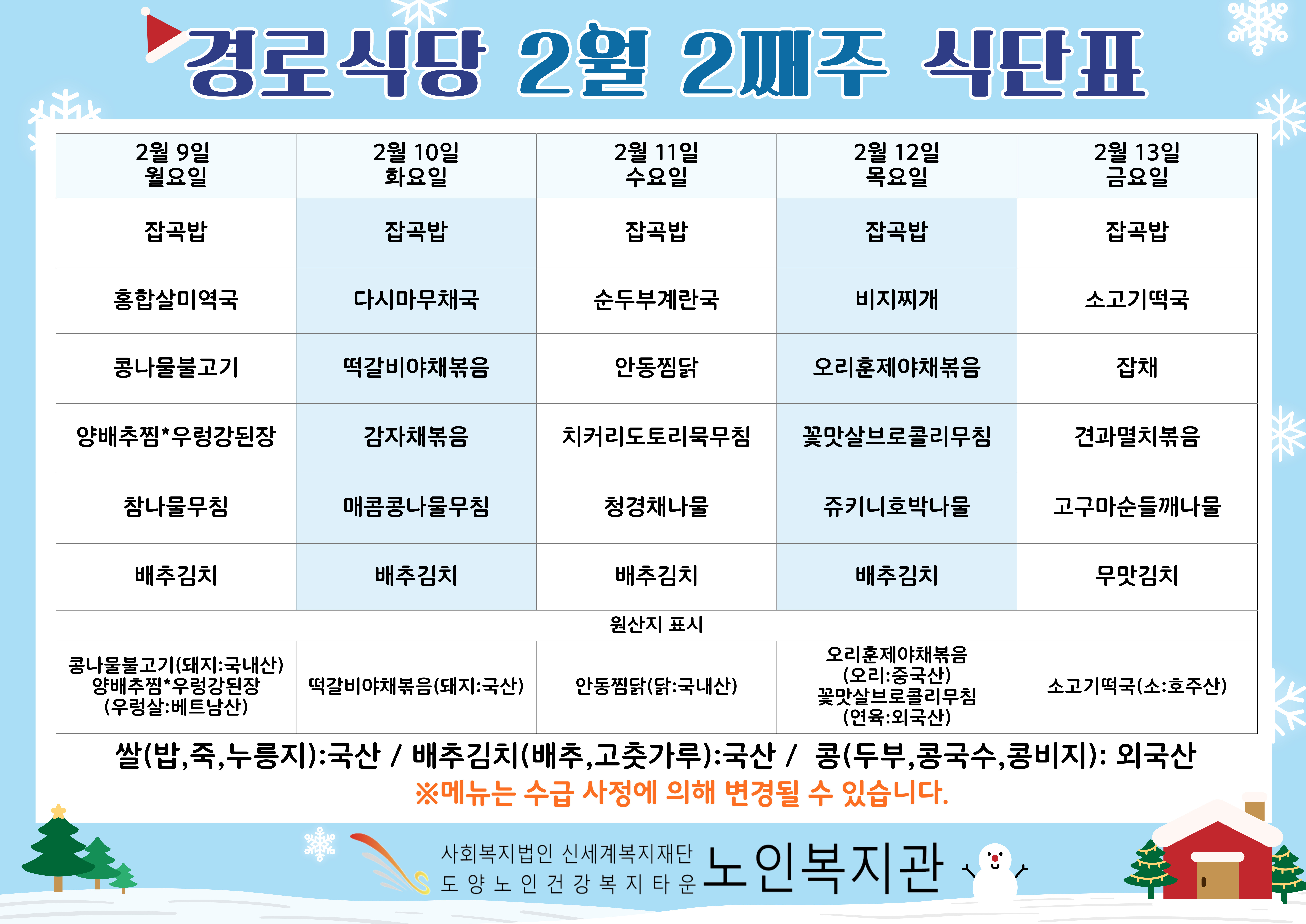 복지관 식단표입니다.