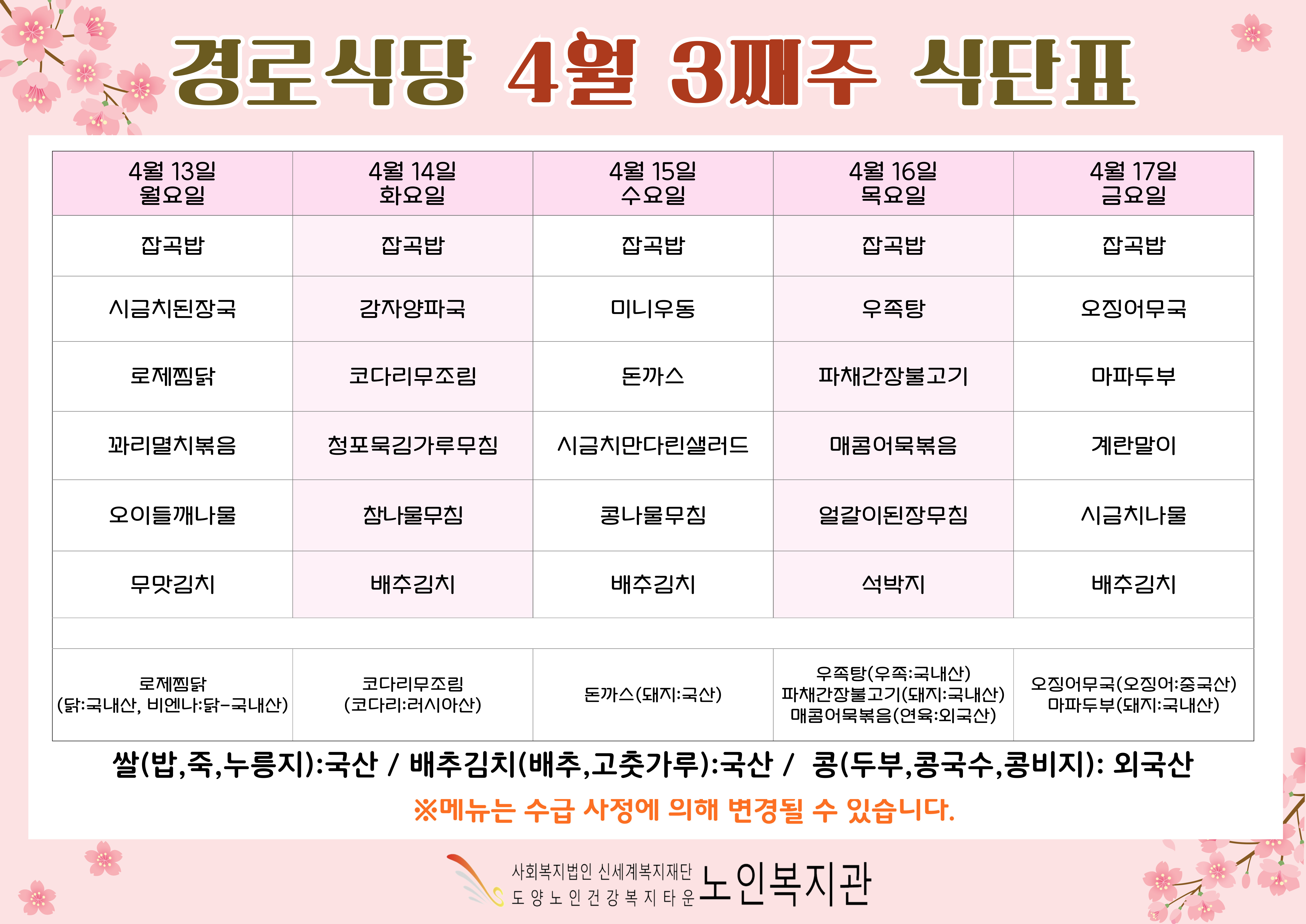 복지관 식단표입니다.