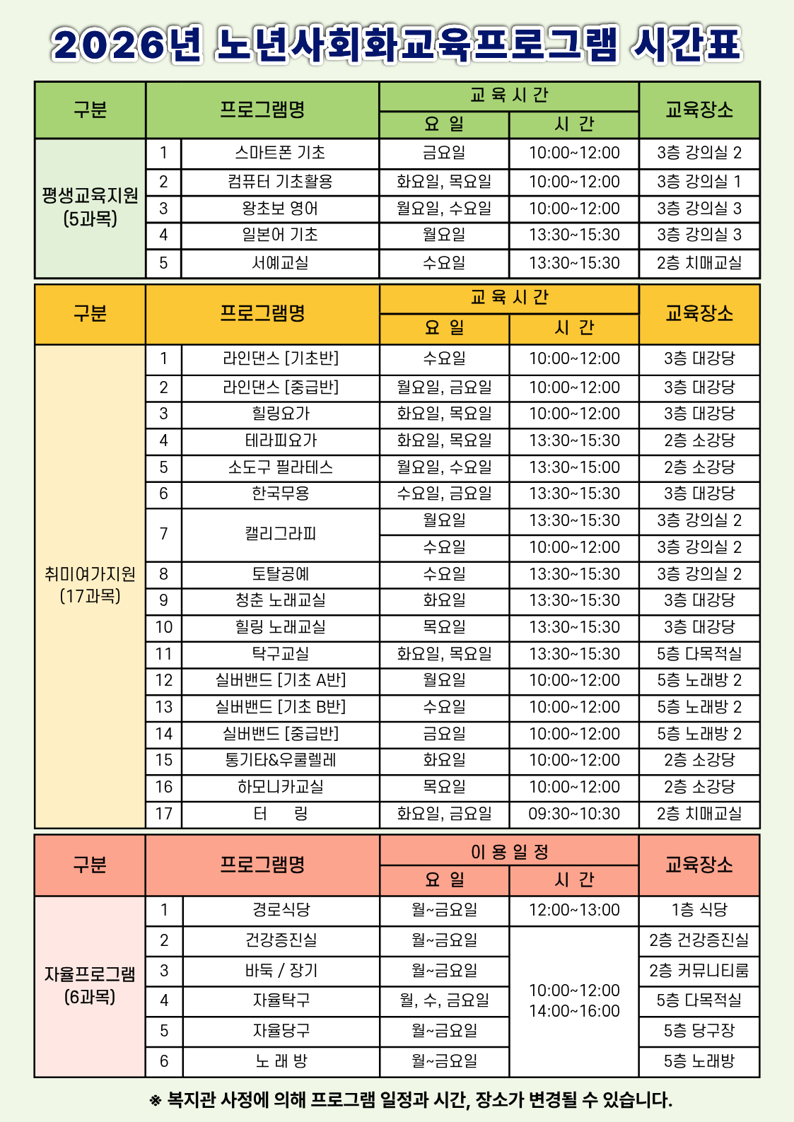 2026년 노년사회화교육 프로그램 예정 시간표