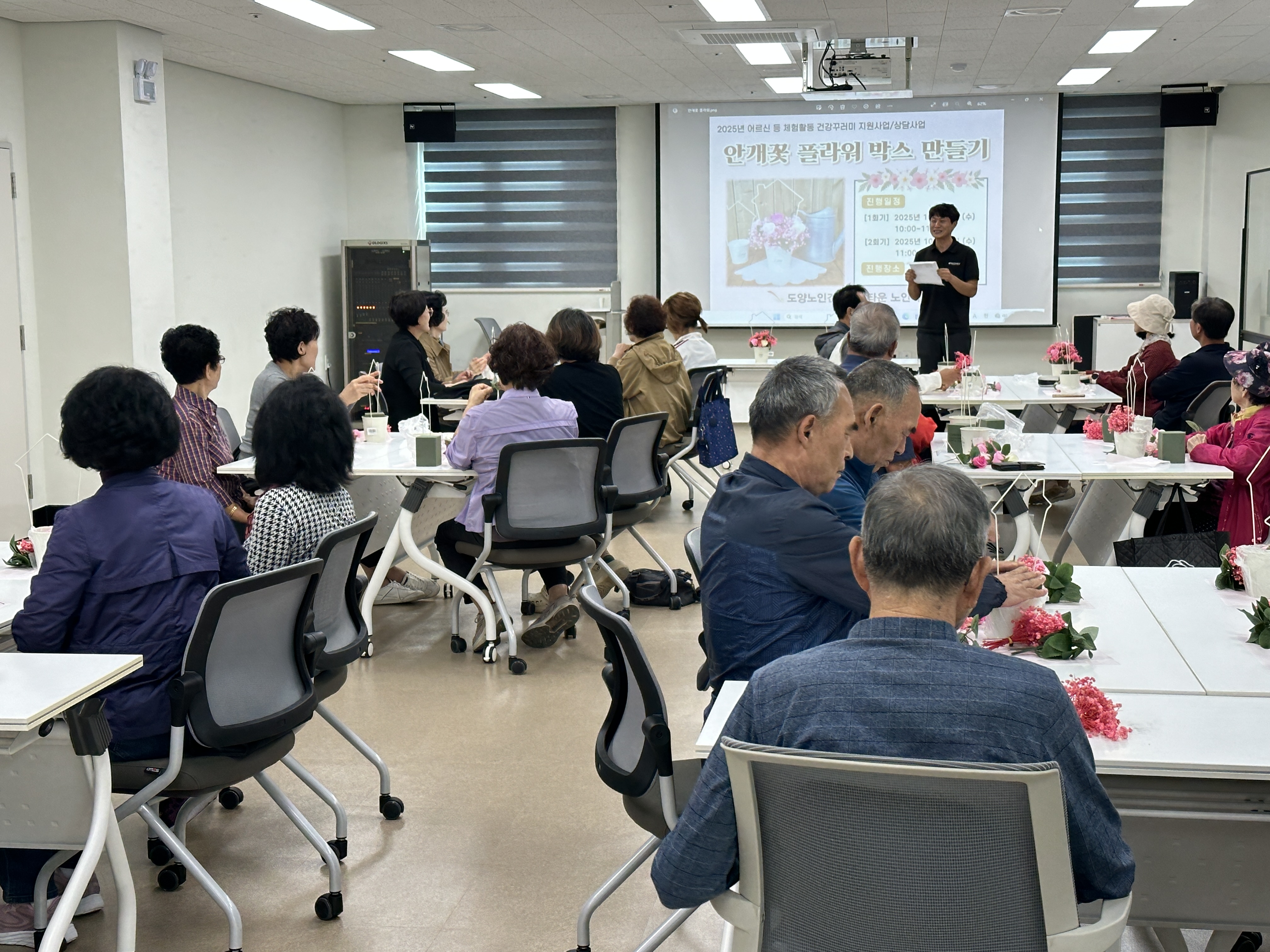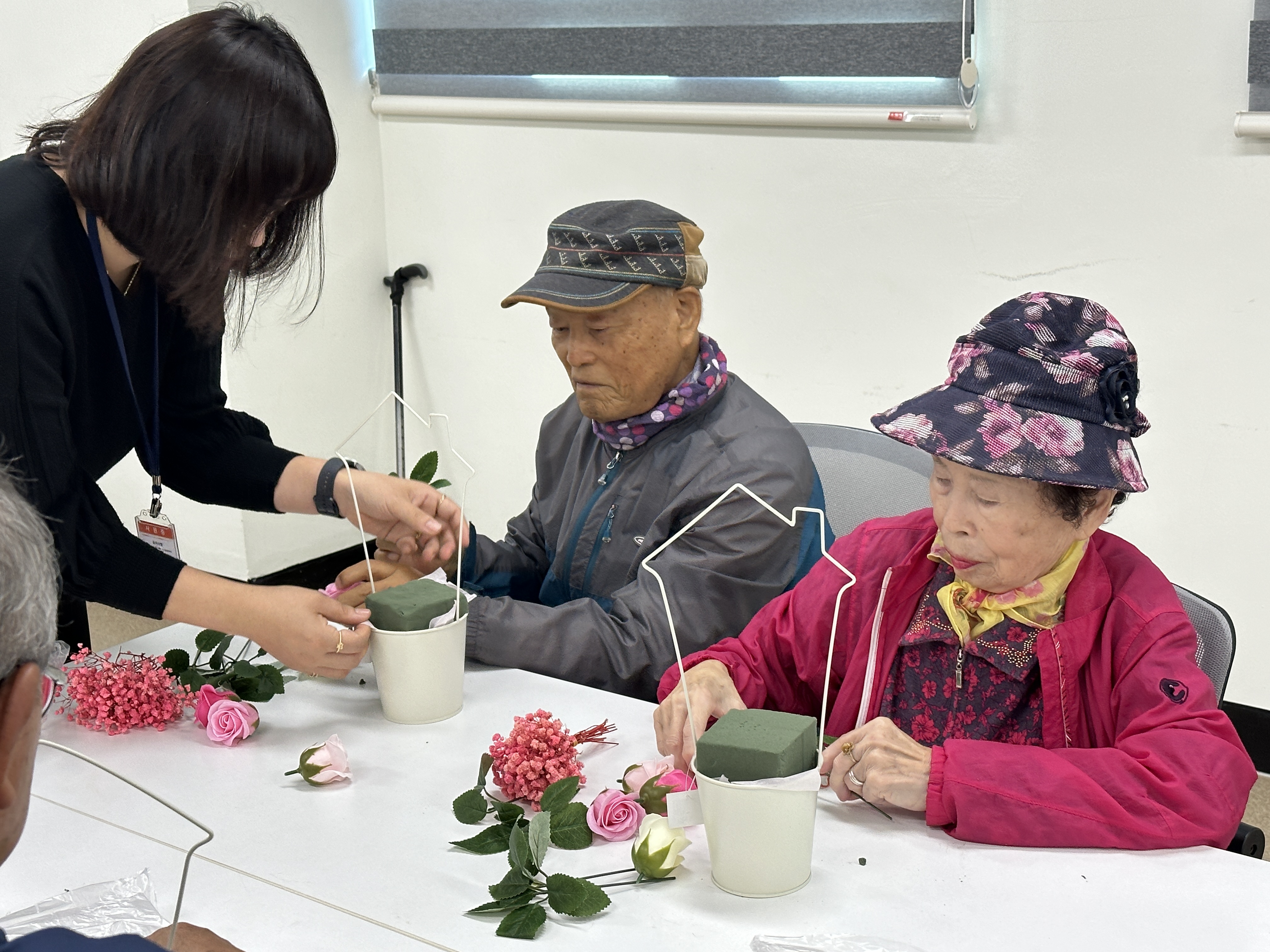 2025년 10월 22일(수) 도양노인건강복지타운 노인복지관은 고흥군 농업정책과의 2025년 어르신 건강체험활동 꾸러미 지원사업에 선정되어 10월 프로그램으로 ‘안개꽃 플라워 박스 만들기’ 체험 및 집단상담을 진행하였습니다. 이번 프로그램은 2회기에 걸쳐 복지관 이용 어르신 60명이 참여하셨으며, 안개꽃 플라워 박스 만들기 체험과 함께 진행된 집단상담을 통해 서로의 경험을 나누고 따뜻한 소통의 시간을 가졌습니다. 체험활동과 집단상담은 어르신들의 정서적 안정과 유대감 형성, 그리고 건강 증진에도 큰 도움이 되는 시간이었습니다. 앞으로도 도양노인건강복지타운 노인복지관은 어르신들께 다양한 프로그램 참여 기회를 제공하고, 신체적ㆍ정신적 건강 향상에 도움이 될 수 있도록 최선을 다하겠습니다. 감사합니다.