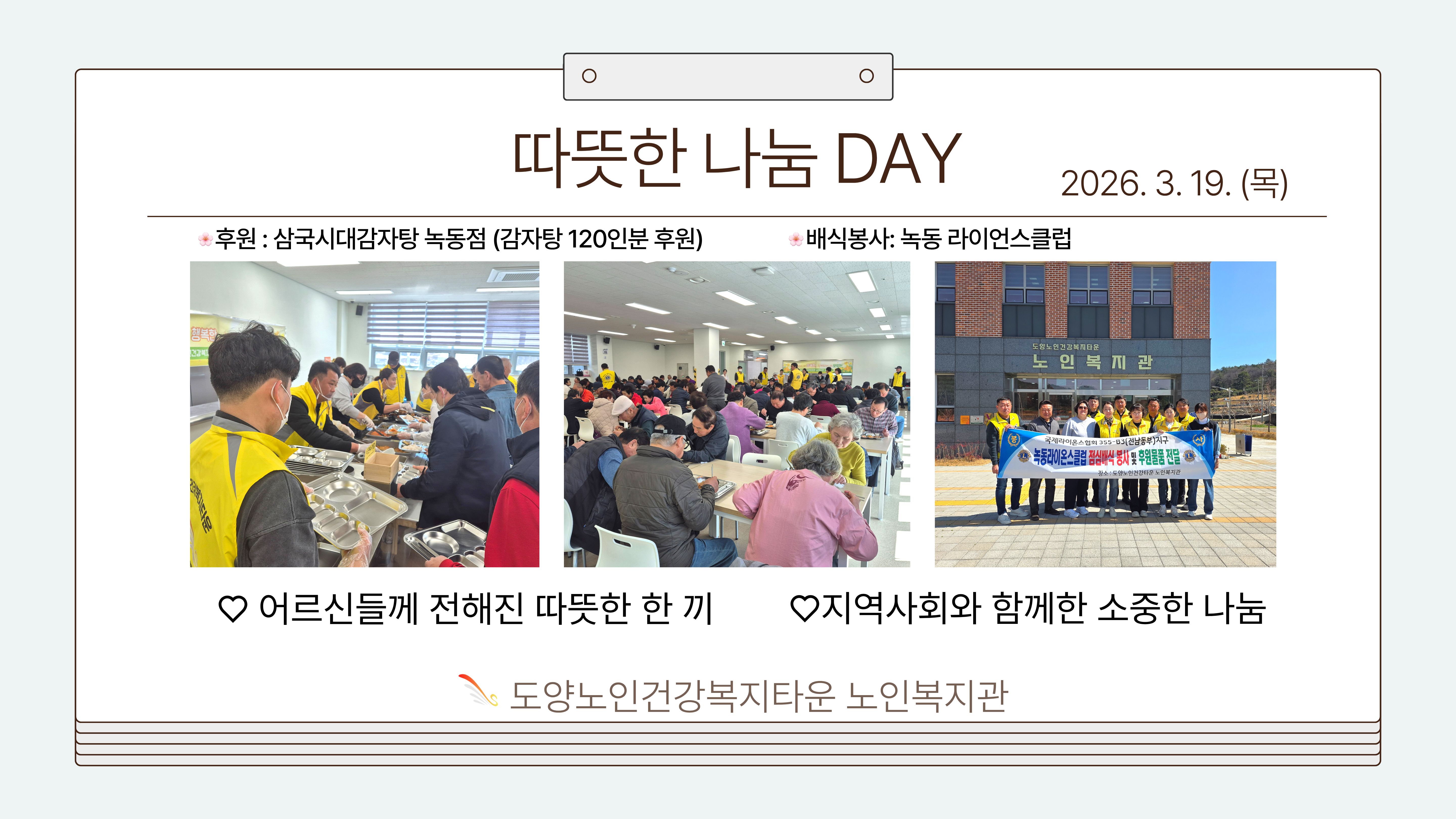♡ 따뜻한 나눔이 전해진 하루 ♡ 도양노인건강복지타운 노인복지관 경로식당에서는 삼국시대감자탕 녹동점의 후원과 라이온스클럽의 배식봉사로 어르신들께 감자탕 120인분을 제공하였습니다. 이날 라이온스클럽 회장님과 회원분들께서는 직접 배식봉사에 참여해 주시며 어르신 한 분 한 분께 따뜻한 마음을 전해주셨습니다. 정성 가득한 식사를 통해 어르신들께서는 든든한 한 끼와 함께 행복한 시간을 보내실 수 있었습니다. 지역사회를 위한 소중한 나눔을 실천해 주신 라이온스클럽과 삼국시대감자탕 녹동점에 깊이 감사드립니다. 앞으로도 도양노인건강복지타운 노인복지관은