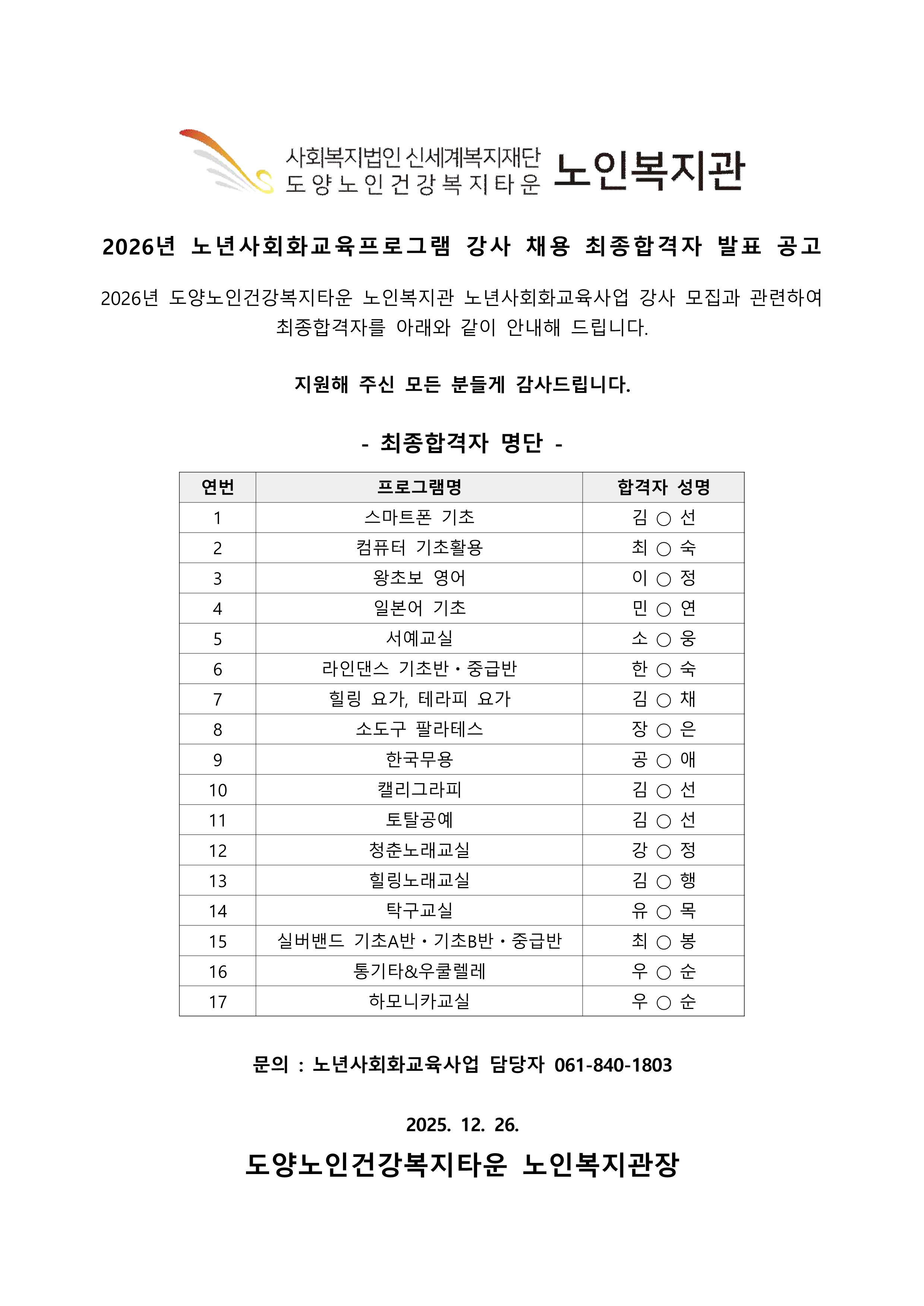 2026년 노년사회화교육프로그램 강사 채용 최종합격자 발표 공고
