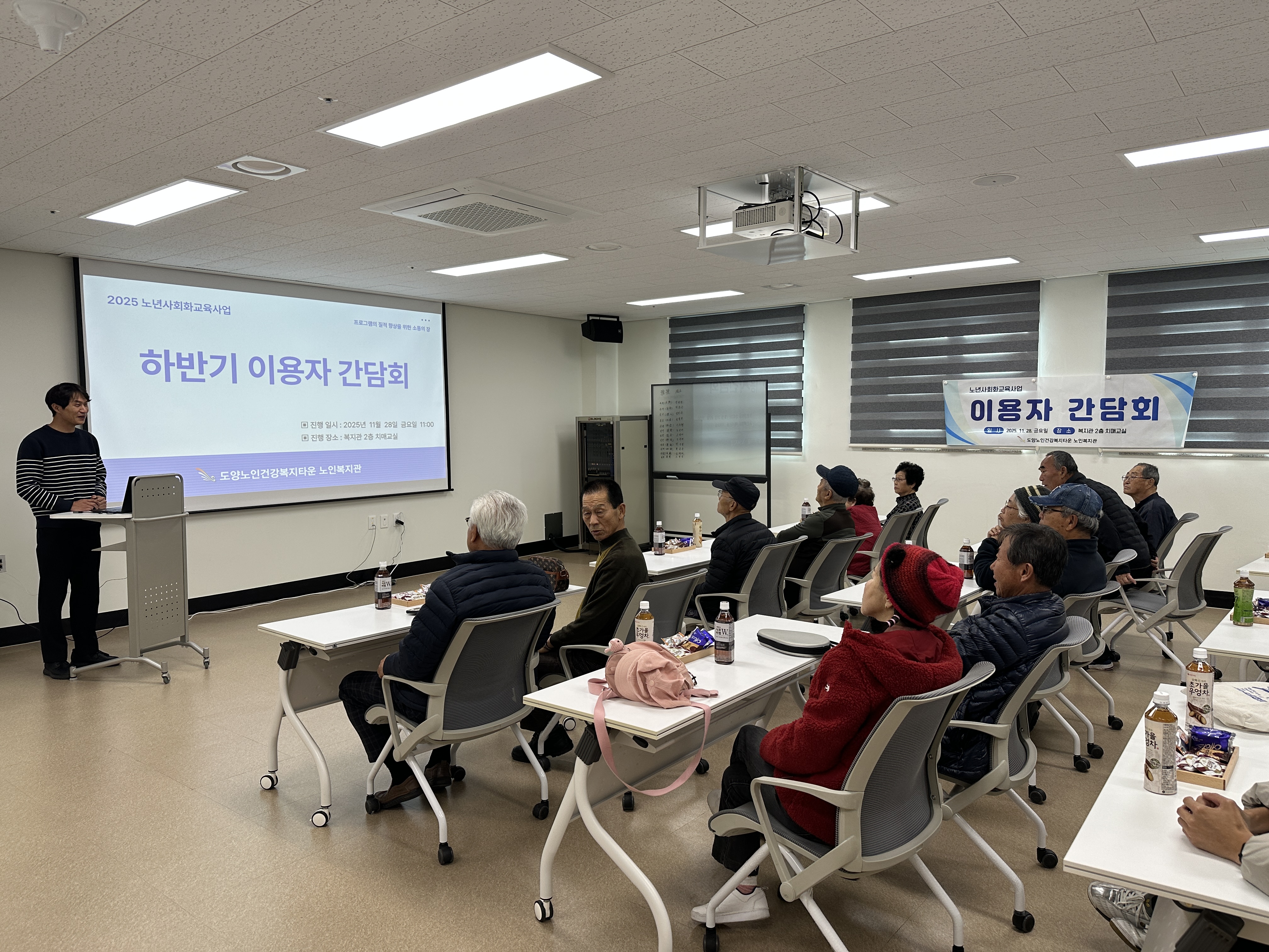 2025.11.28.(금) 도양노인건강복지타운 노인복지관은 노년사회화교육 프로그램에 참여하고 계신 어르신들을 대상으로 2025년 하반기 이용자간담회를 실시하였습니다. 이번 간담회는 복지관 운영의 투명성과 참여도를 높이기 위한 자리로, 프로그램 전반에 대한 만족도와 애로사항 및 건의사항을 청취하며, 어르신들의 다양한 의견을 공유하였습니다. 이를 바탕으로 보다 실질적이고 효율적인 프로그램 개선 방안을 모색하고, 이용자와 복지관이 함께 소통할 수 있는 뜻깊은 시간이 되었습니다. 앞으로도 도양노인건강복지타운 노인복지관은 어르신들의 의견을 적극 반영하여 만족도 높은 노년사회화교육 프로그램을 제공할 수 있도록 최선을 다하겠습니다.