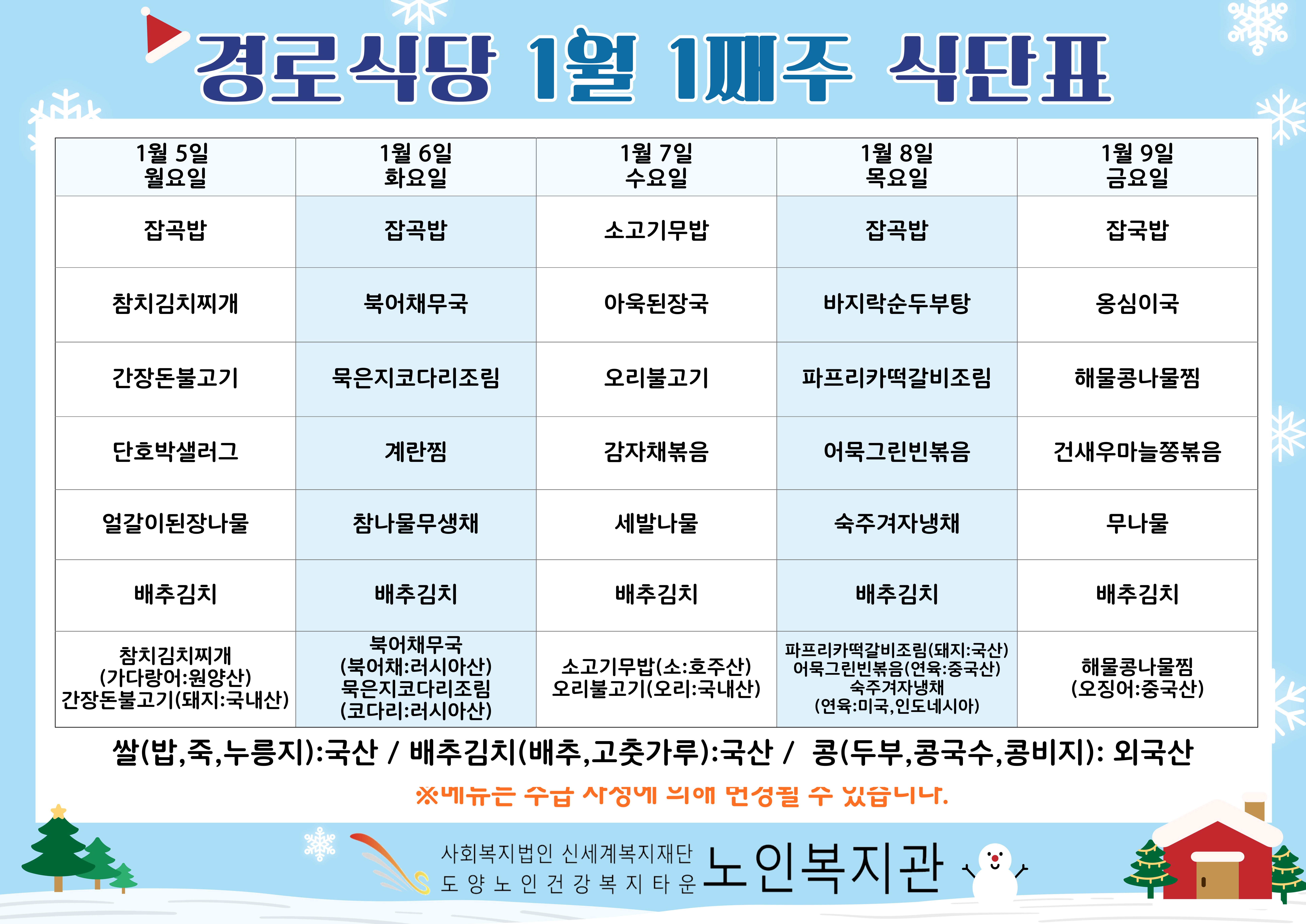 복지관 식단표입니다.