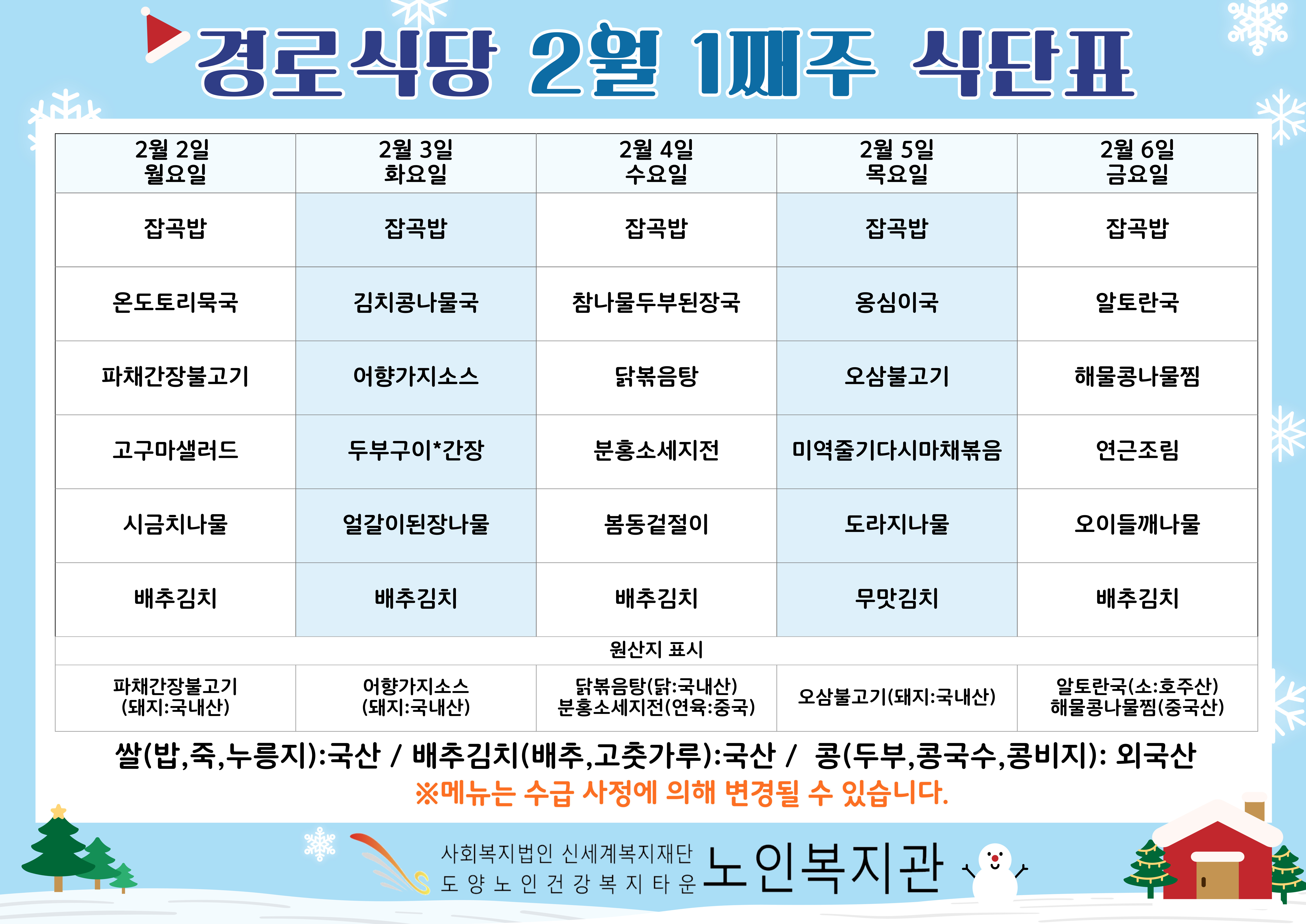 복지관 식단표입니다.