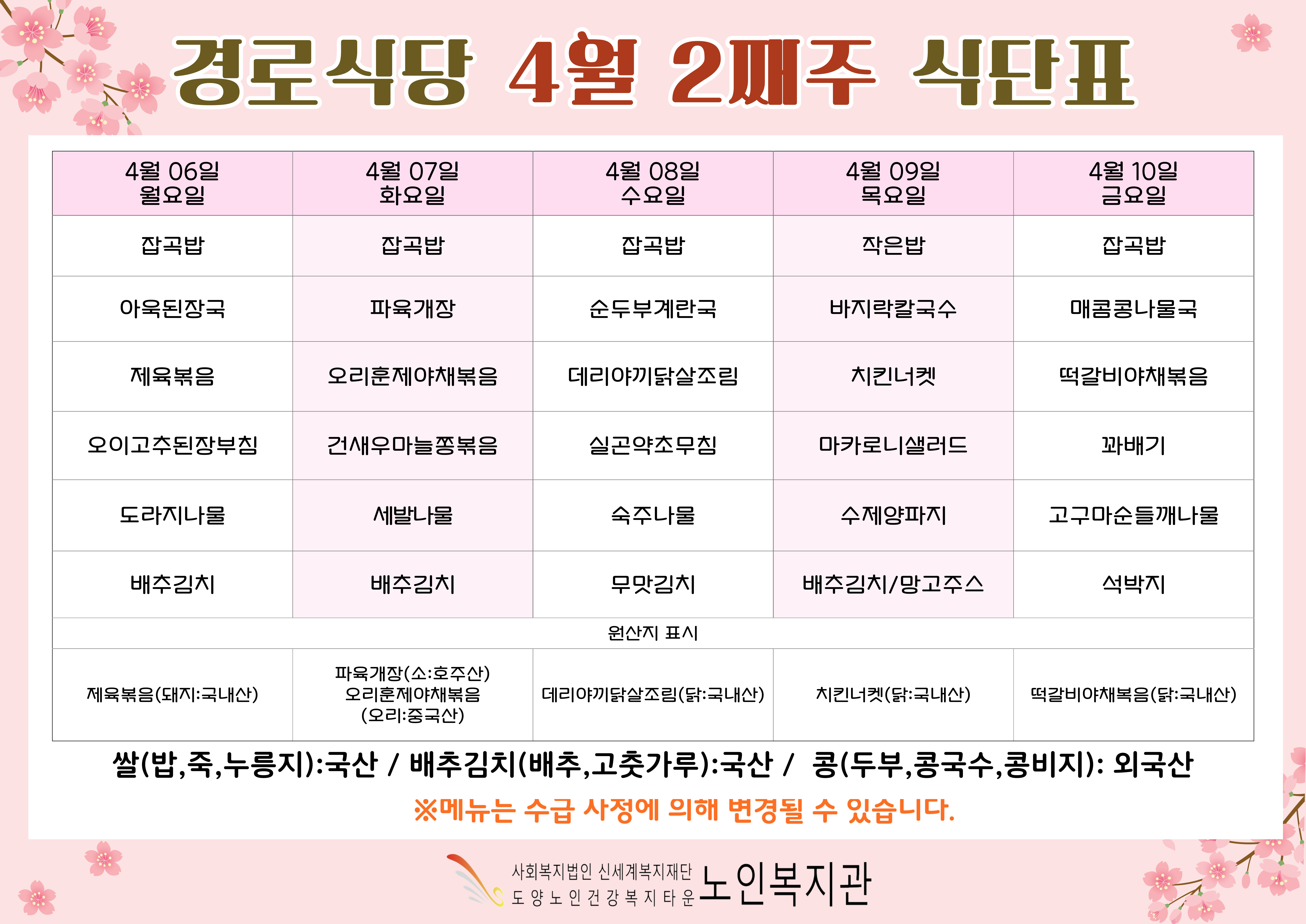 복지관 식단표입니다.