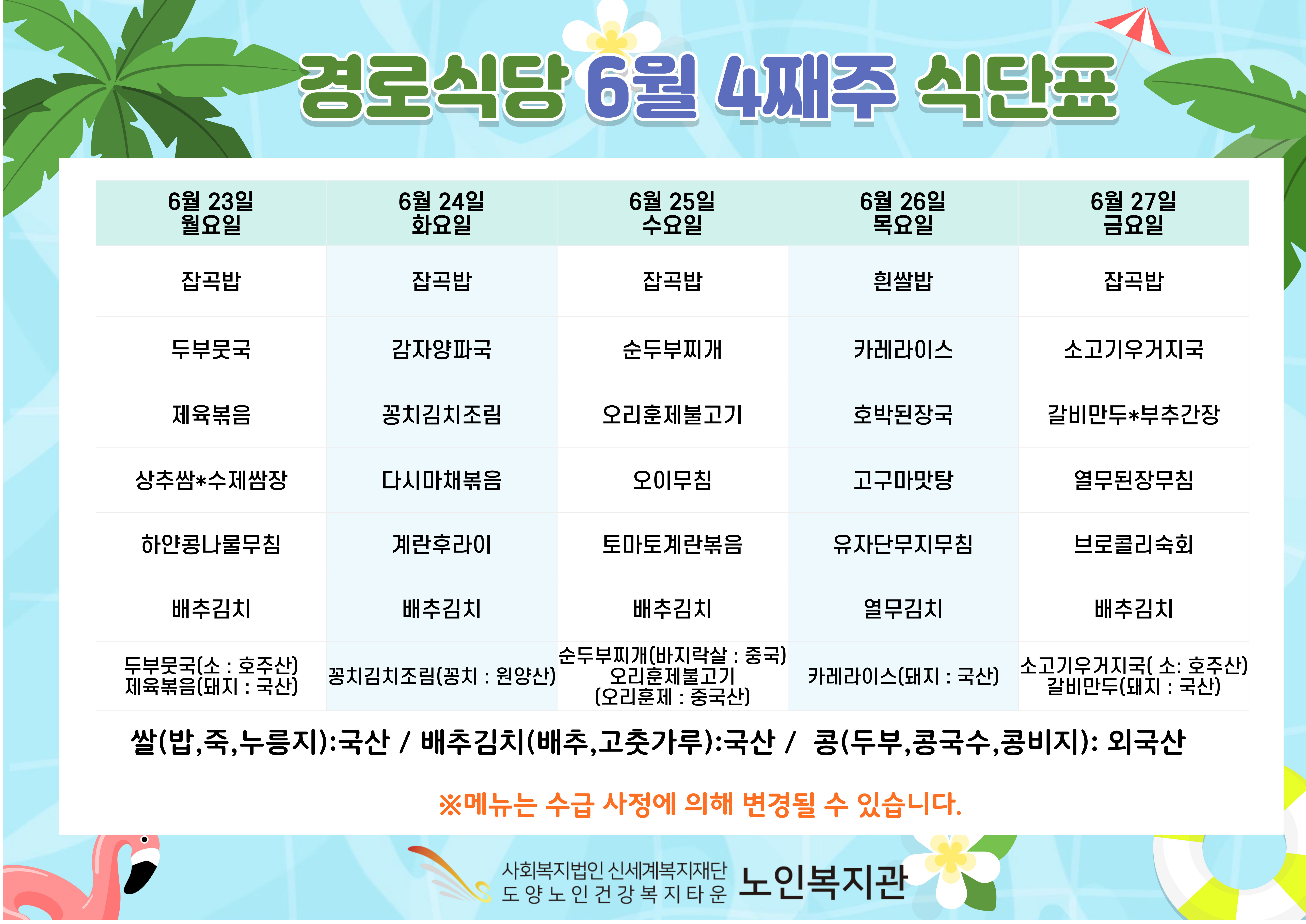 복지관 식단표입니다.