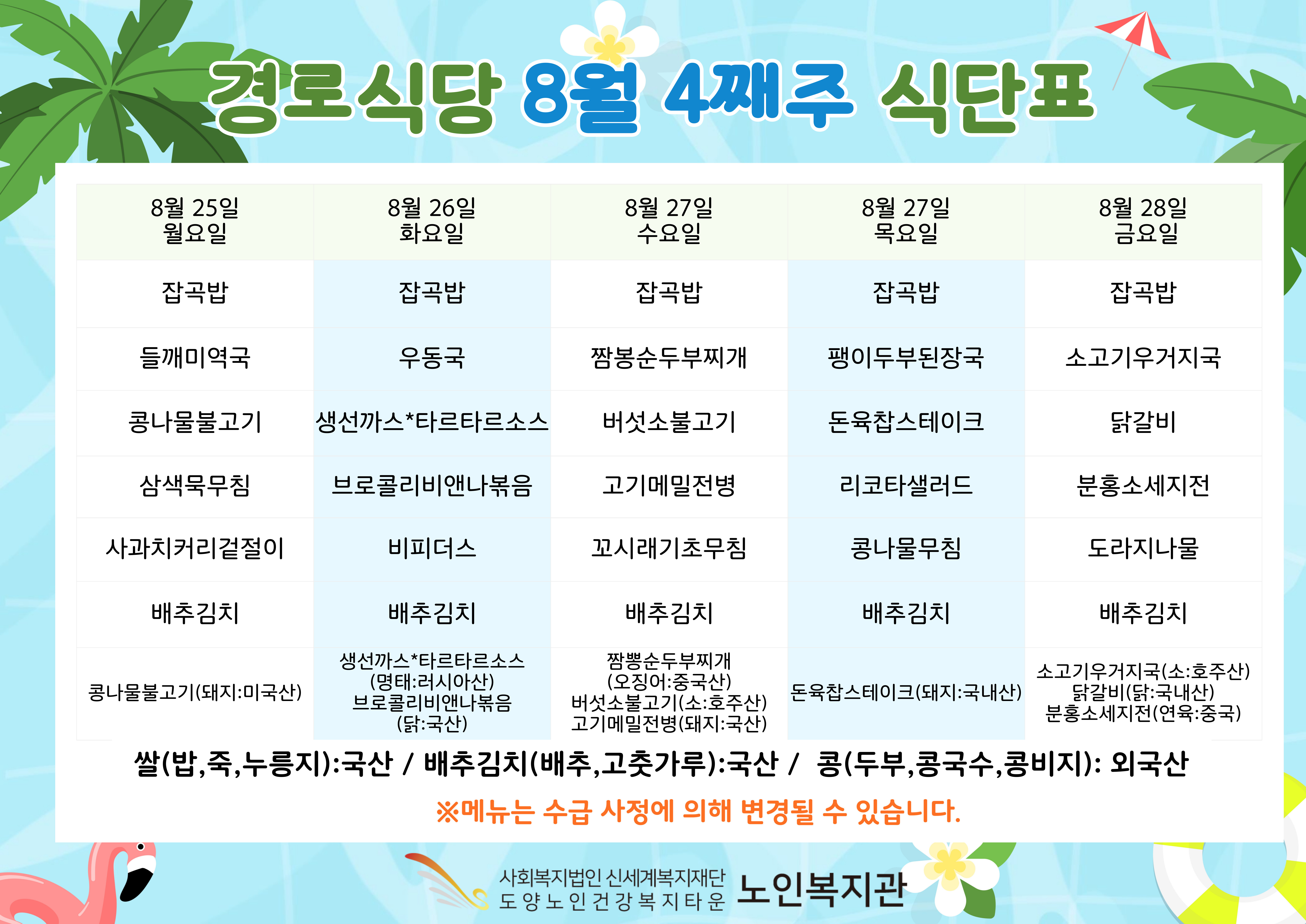 복지관 식단표입니다.