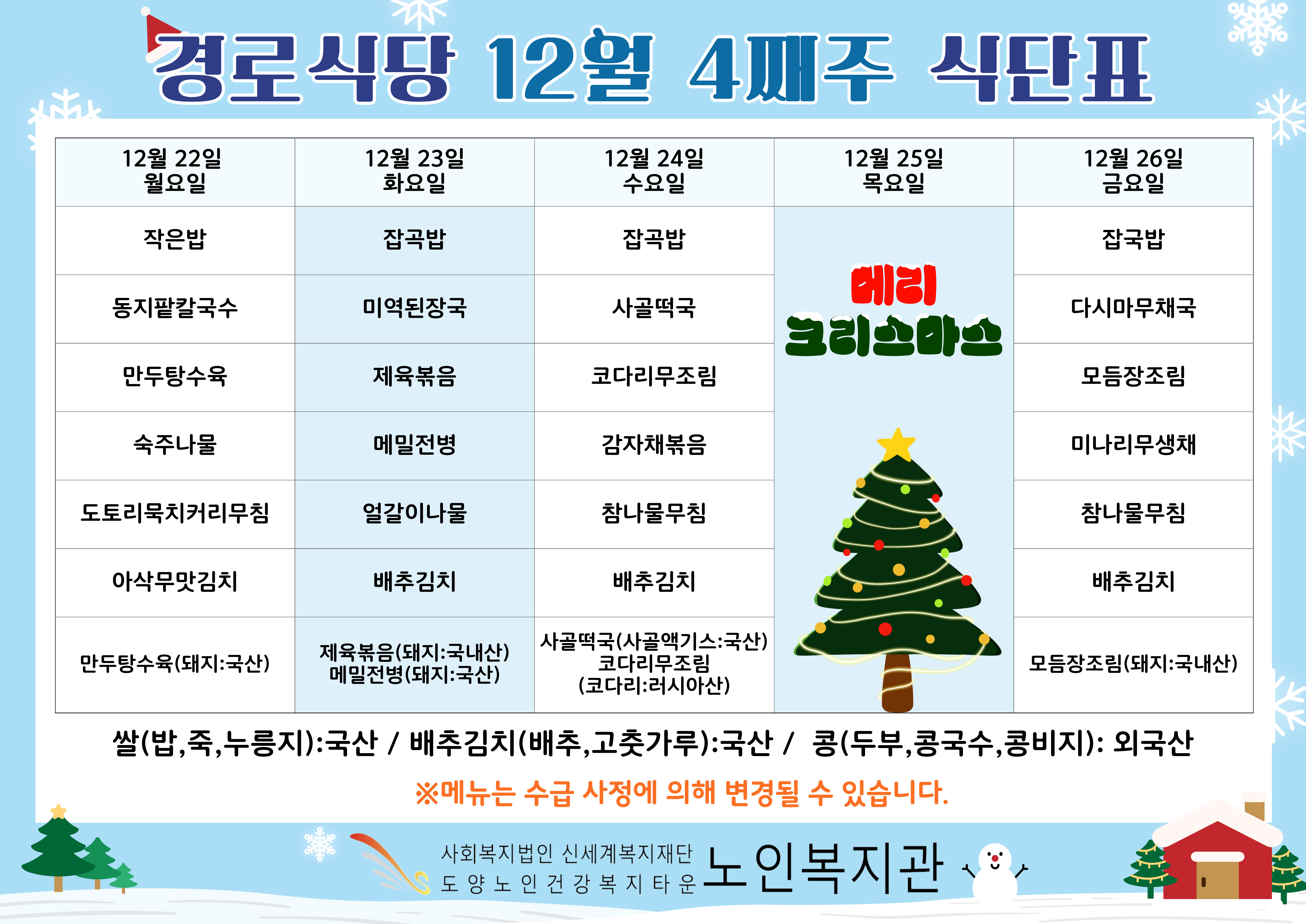 복지관 식단표입니다.