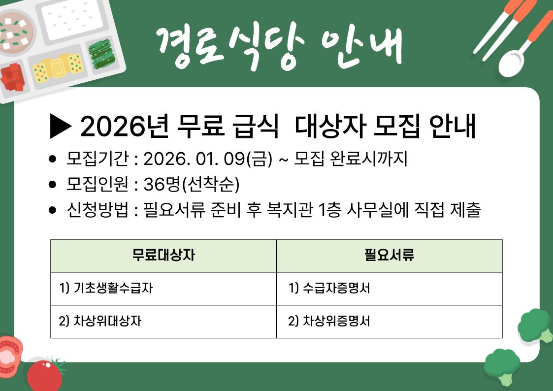 2026년01월 09일 [경로식당] 무료 급식 대상자 모집일정 내용